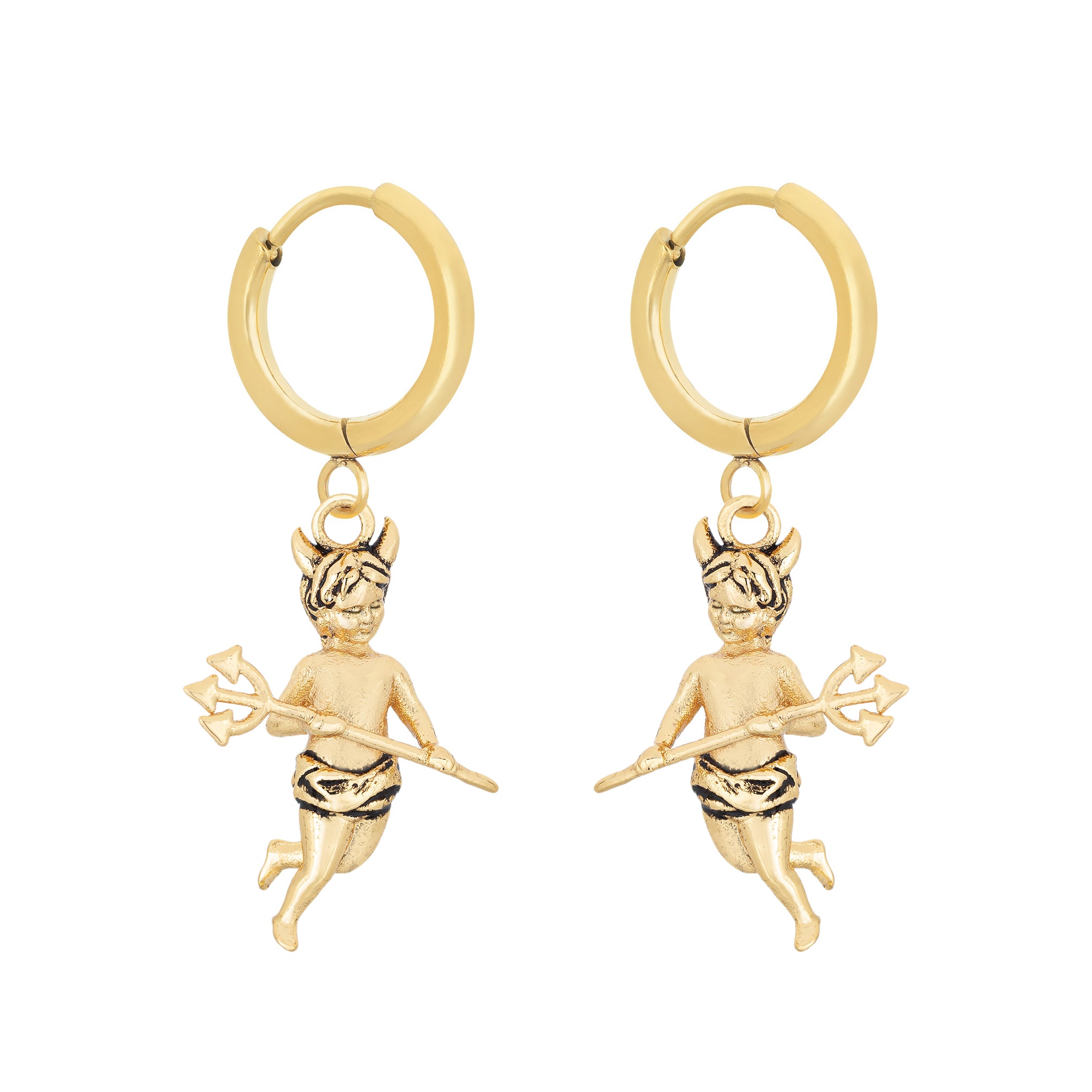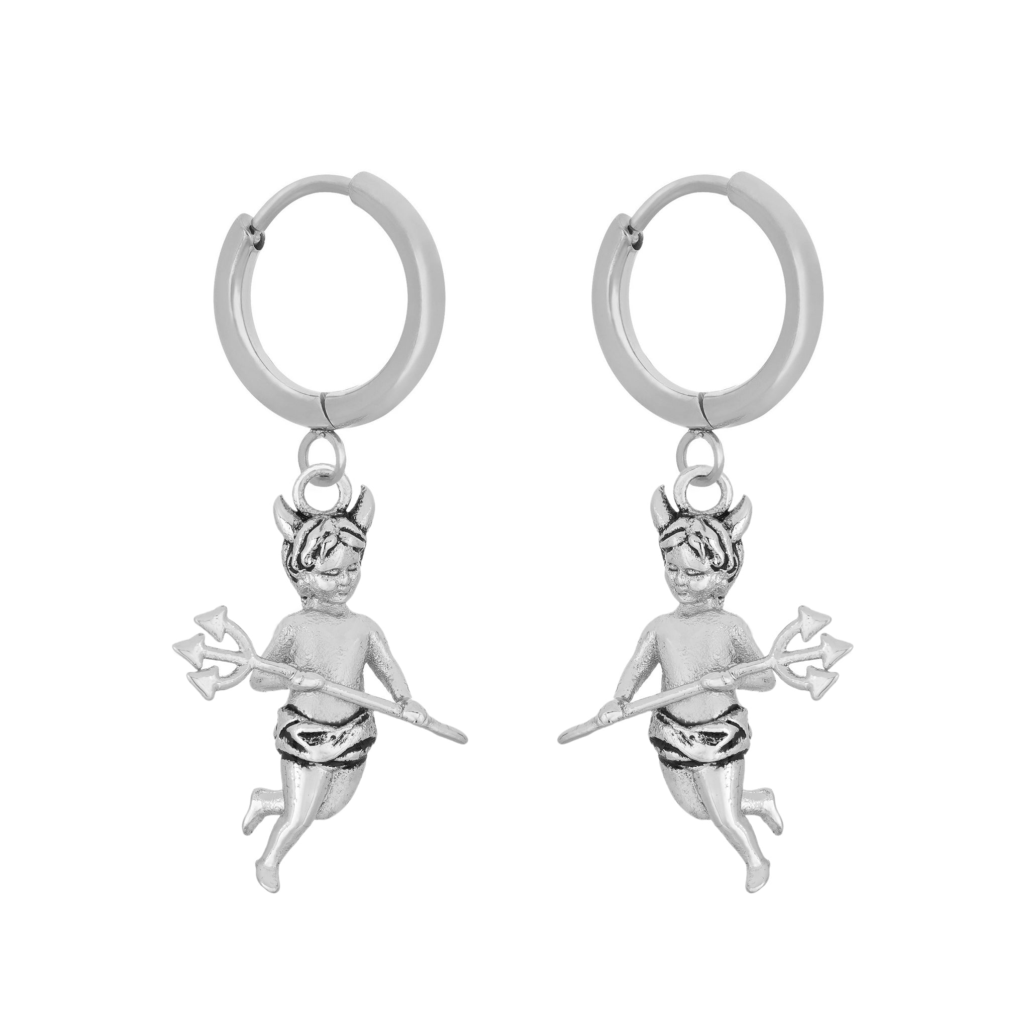 Feeling naughty. nice. or both? These antique inspired drop hoop earrings feature little devil cherubs up to no good. Perfect to mix and match with our Angel Earrings.