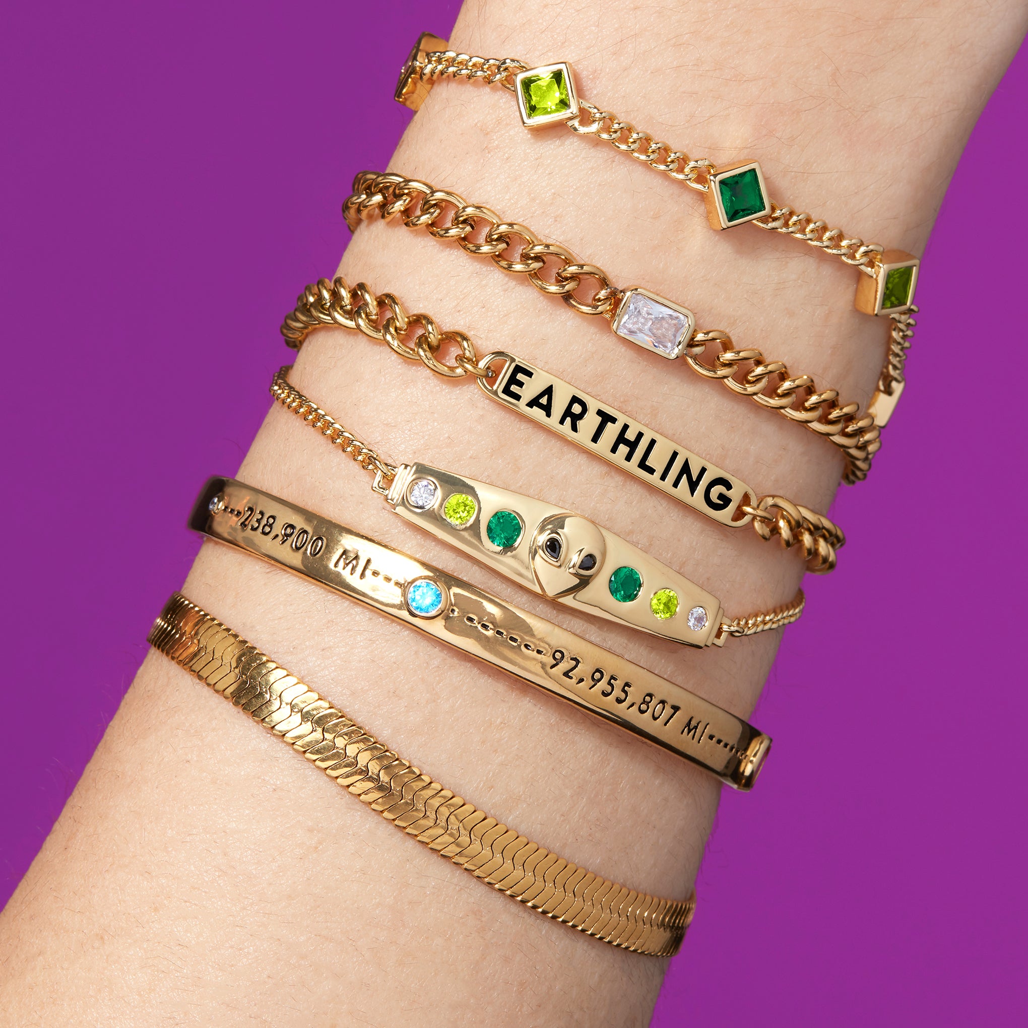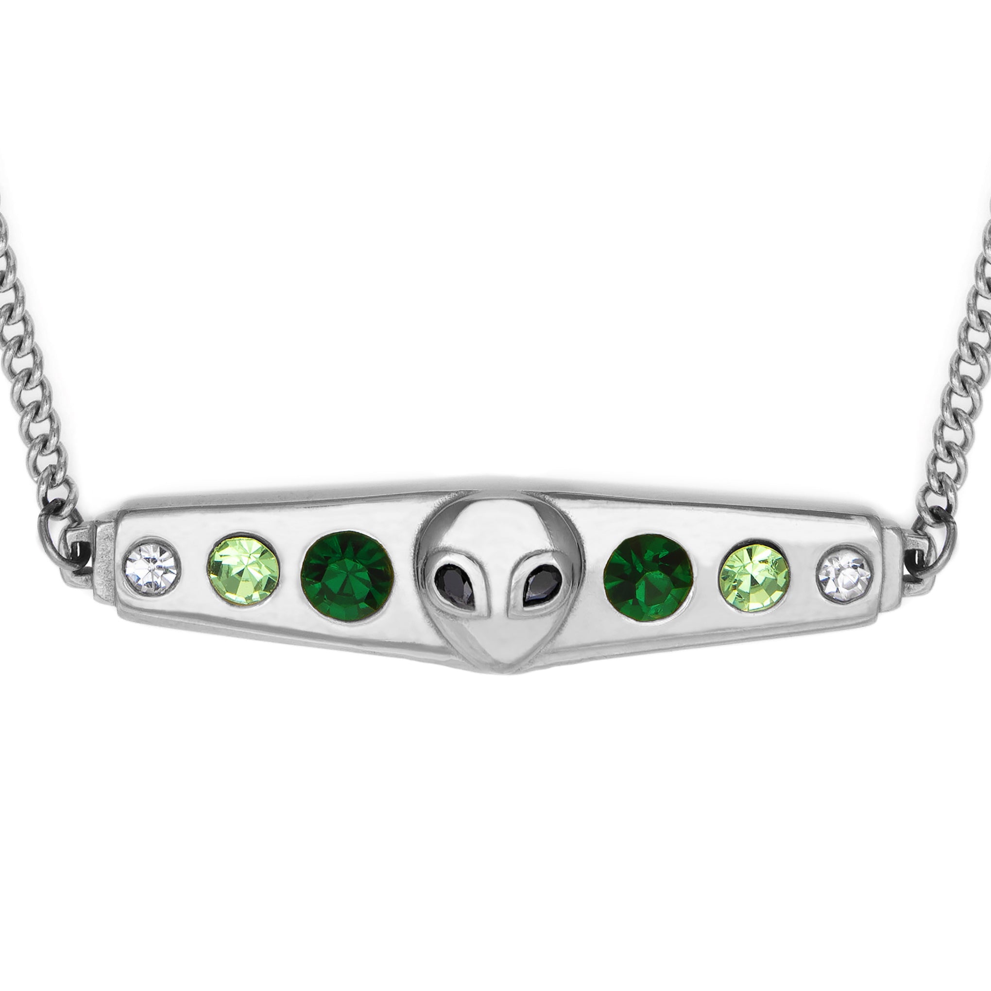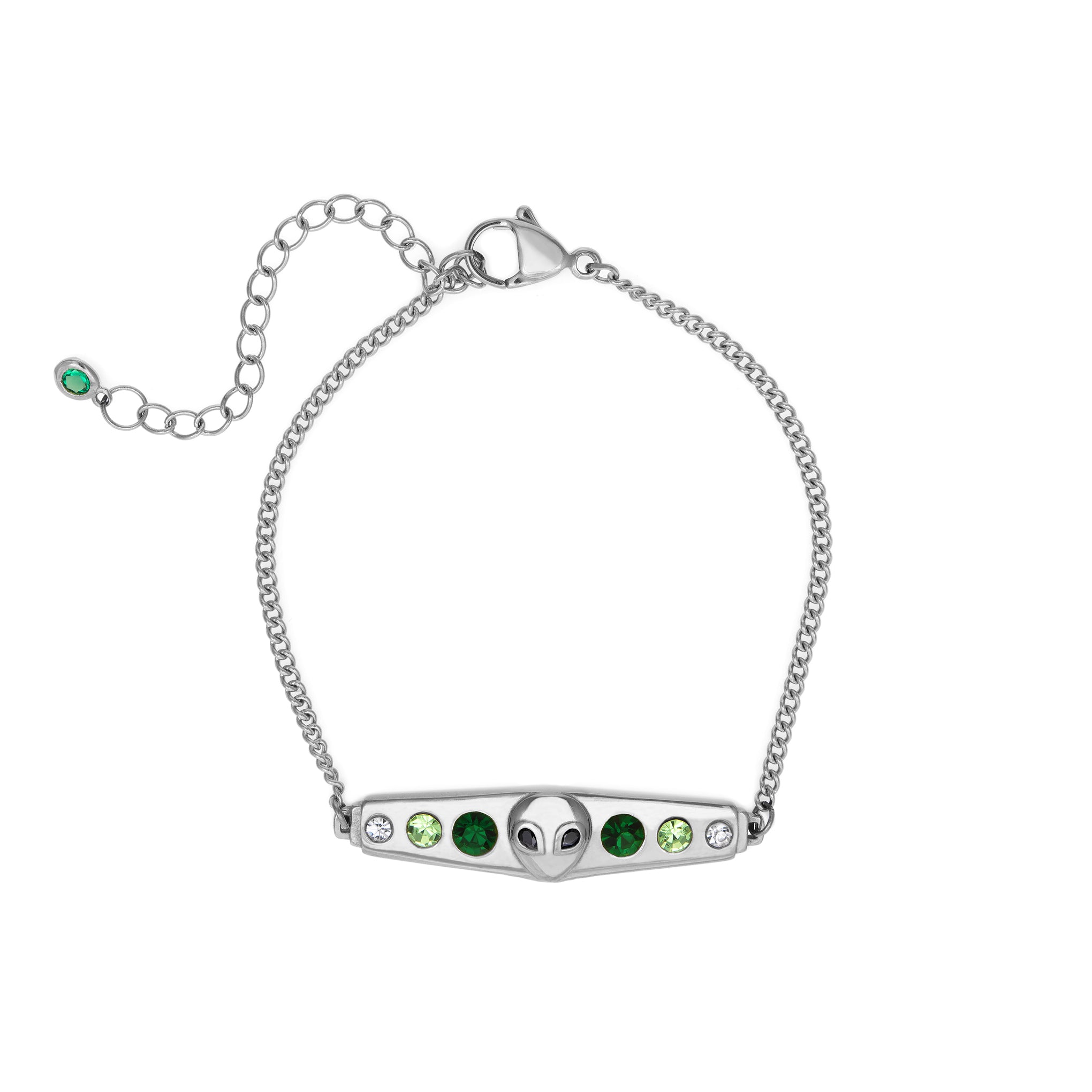 73% of all reported alien encounters in the US are of Grey aliens. also known as Roswell Greys or Zeta Reticulans. They are typically described as being human-like with small bodies. smooth grey-colored skin. enlarged hairless heads. and large black eyes. They lack external human body parts such as noses. ears. and mouths. Though referenced in literature since the late 1800s. newspaper reports from 1965 of the Betty and Barney Hill abduction made the archetype famous. Under hypnosis. Betty produced a “star map” which she claimed located the home planet of her abductors in the Zeta Reticuli star system. Wear the Greys in Silver or Gold with this sweet ID tag style chain bracelet.