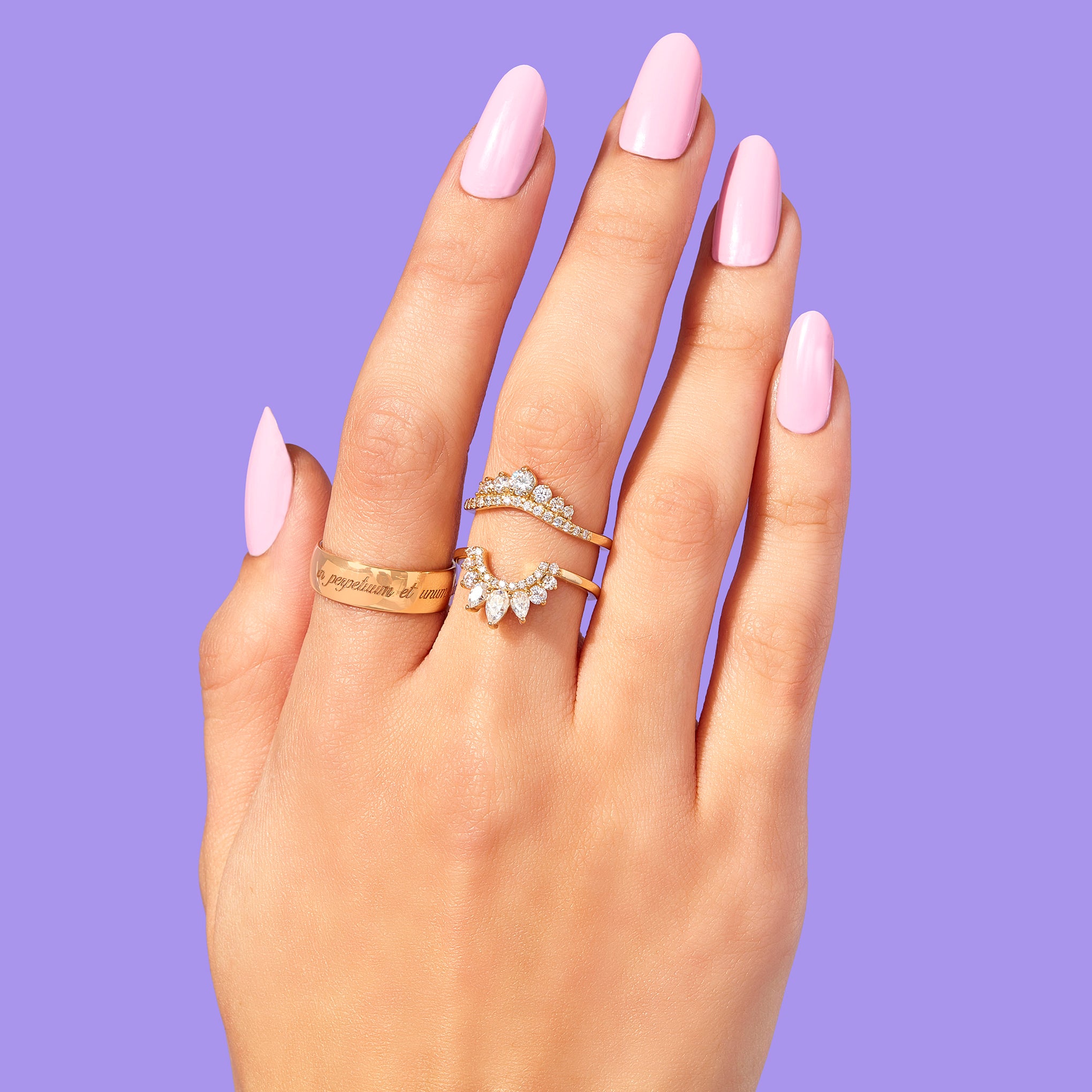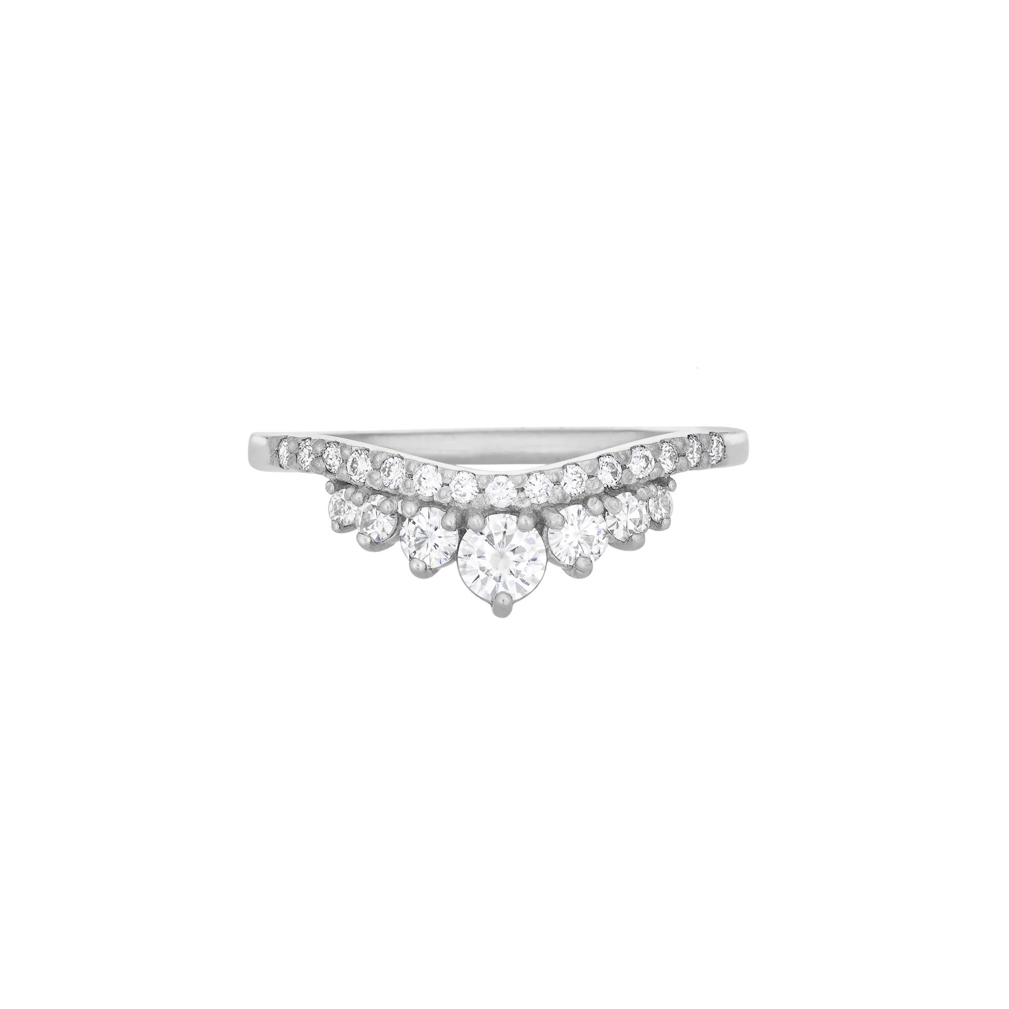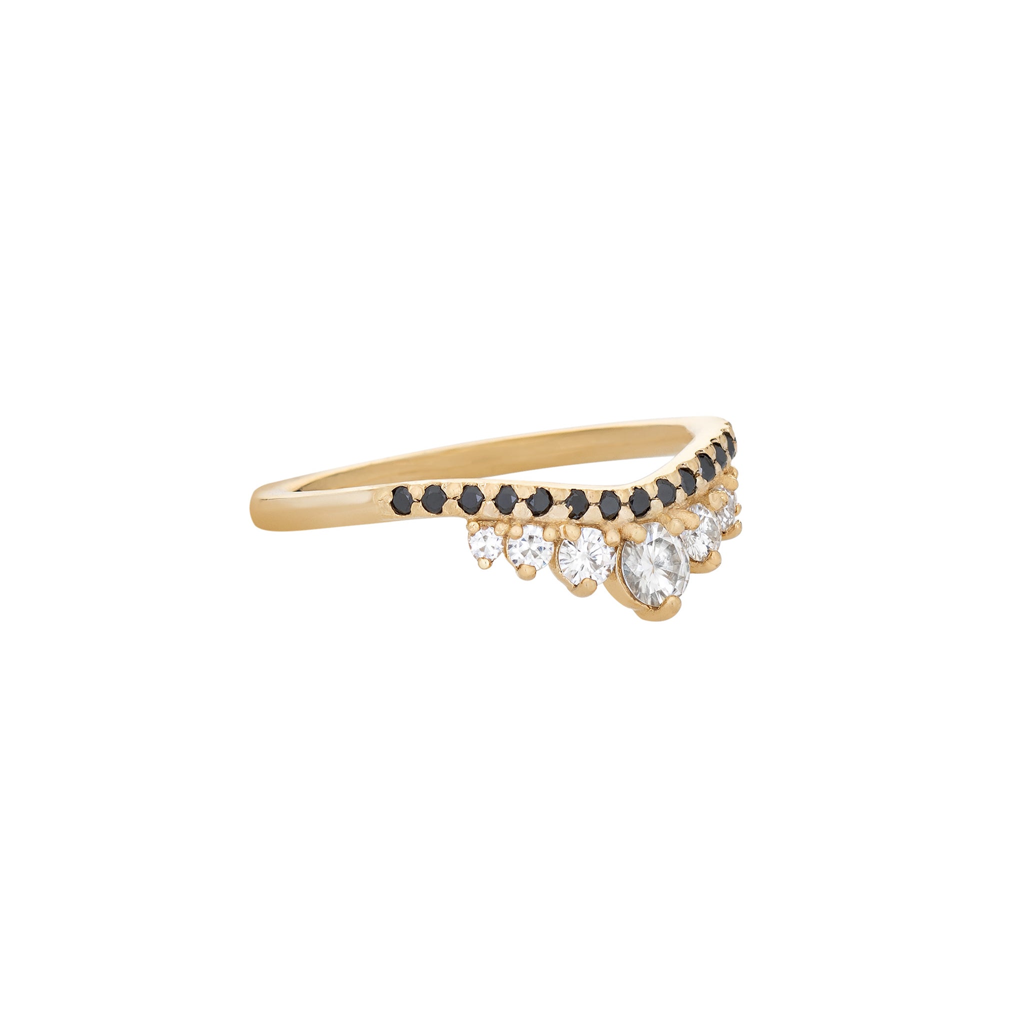An accent ring with a slight curve featuring a double row of stones with various two-tone options for maximum impact. The crown of graduated round stones will enhance the look and size of any ring paired with it. Handmade in Los Angeles. CA using ethical and sustainable gemstones and recycled 14K Gold.