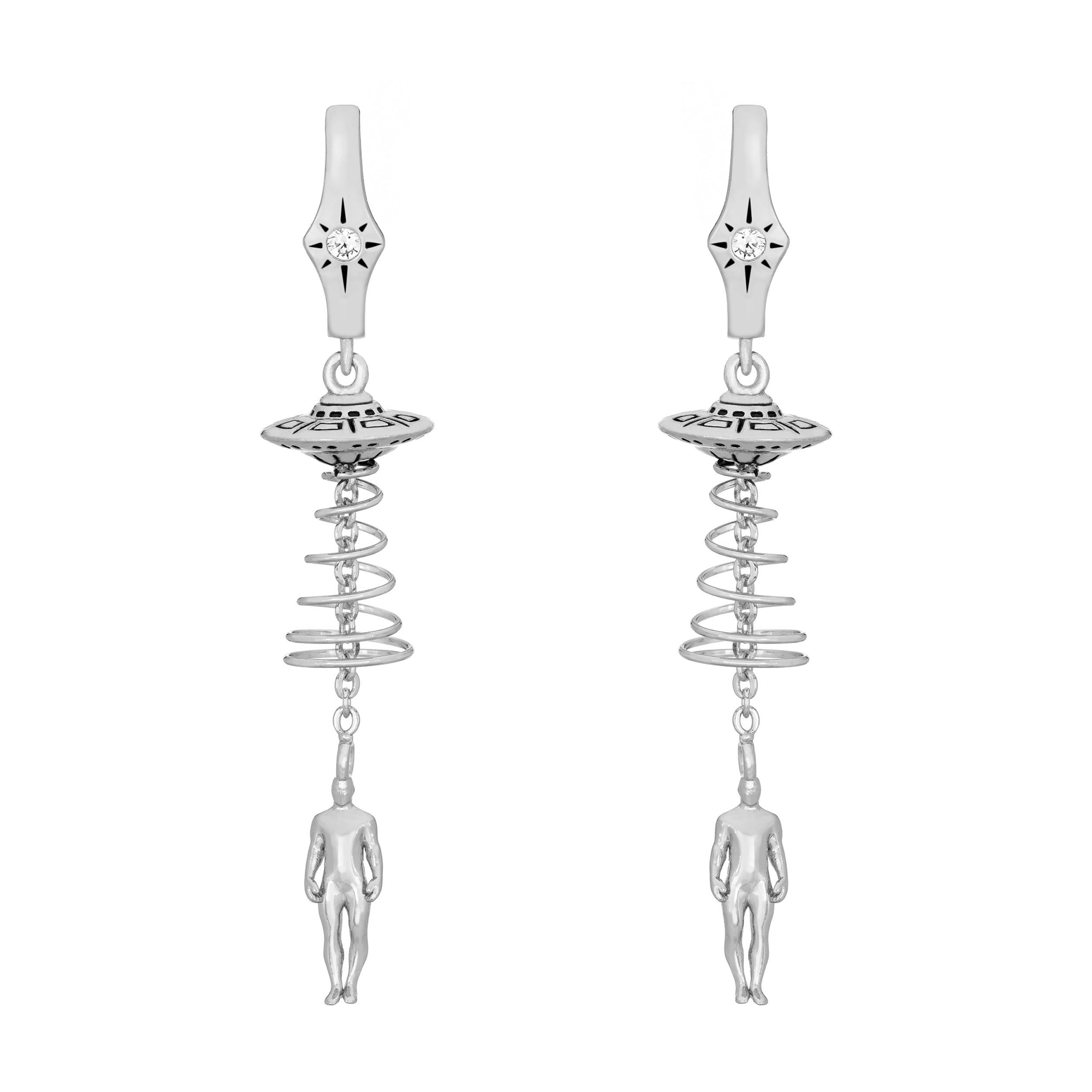 These hoop earrings feature a UFO and a dangling humanoid figure. creating the illusion of an otherworldly encounter in motion. With subtle movement as you wear them. they bring a playful sense of mystery and sci-fi style to any look.