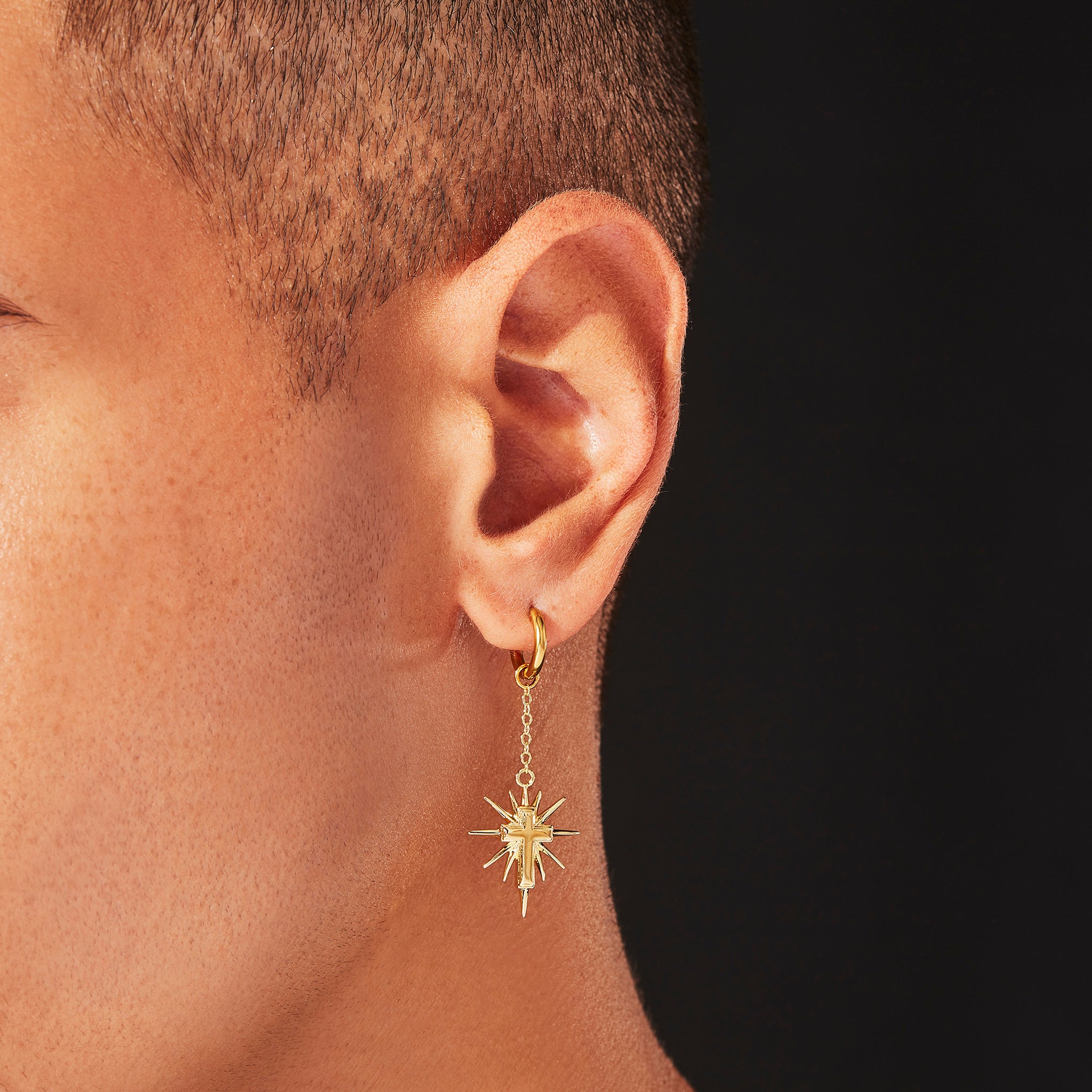 This antique inspired cross charm hangs from a 12mm chain on a 12mm stainless steel hoop.