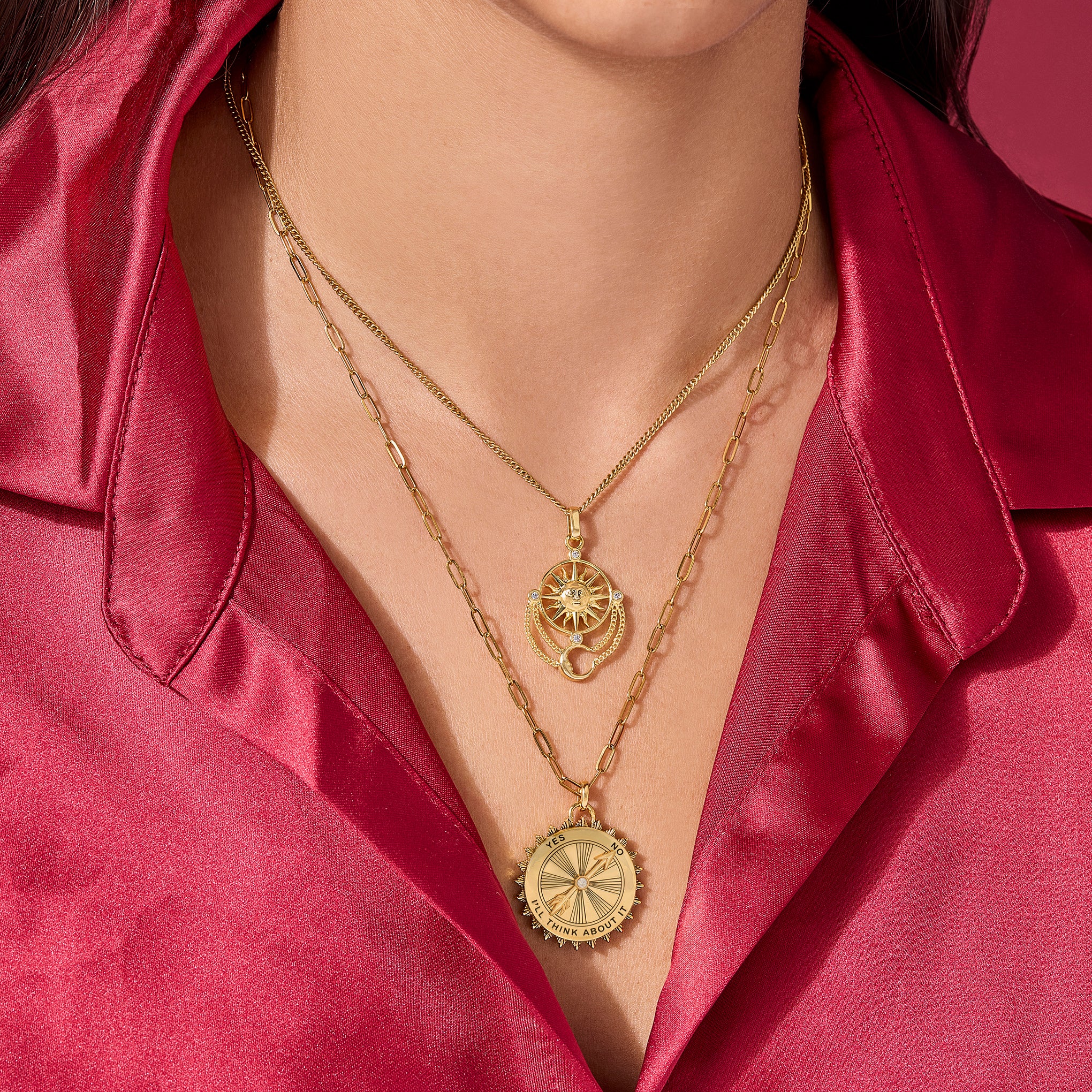 Feeling indecisive? Let the Decider Necklace handle it. This antique-inspired spinner necklace features a rotating arrow that lands on yes. no. or I'll think about it. perfect for when even the smallest choices feel dramatic. A little playful and very good at dodging responsibility. 18in paperclip chain with an extra 2in extension chain.