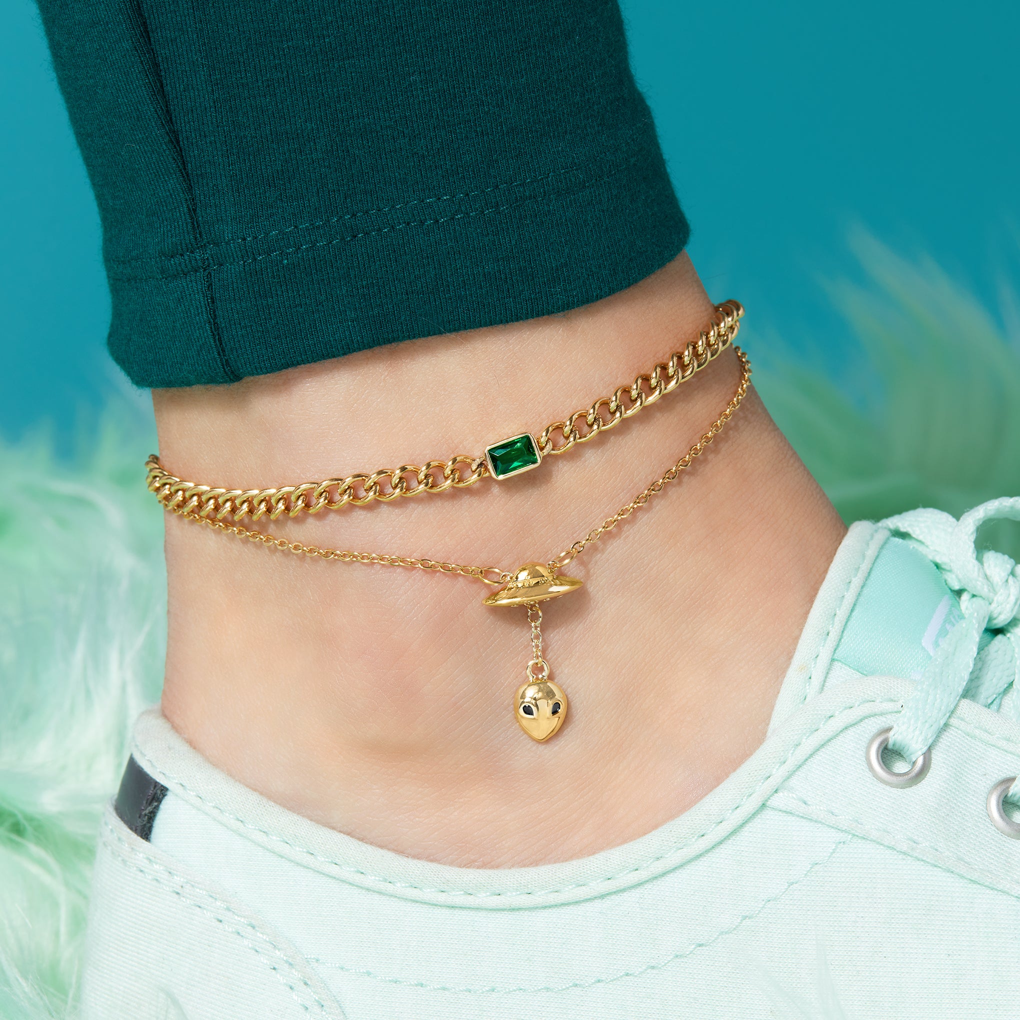 Named after one of Saturn's moons. the Dione Anklet features a bezel set. emerald cut stone on a thick stainless steel chain. Perfect for layering or wearing on its own. Available in 4 colors.