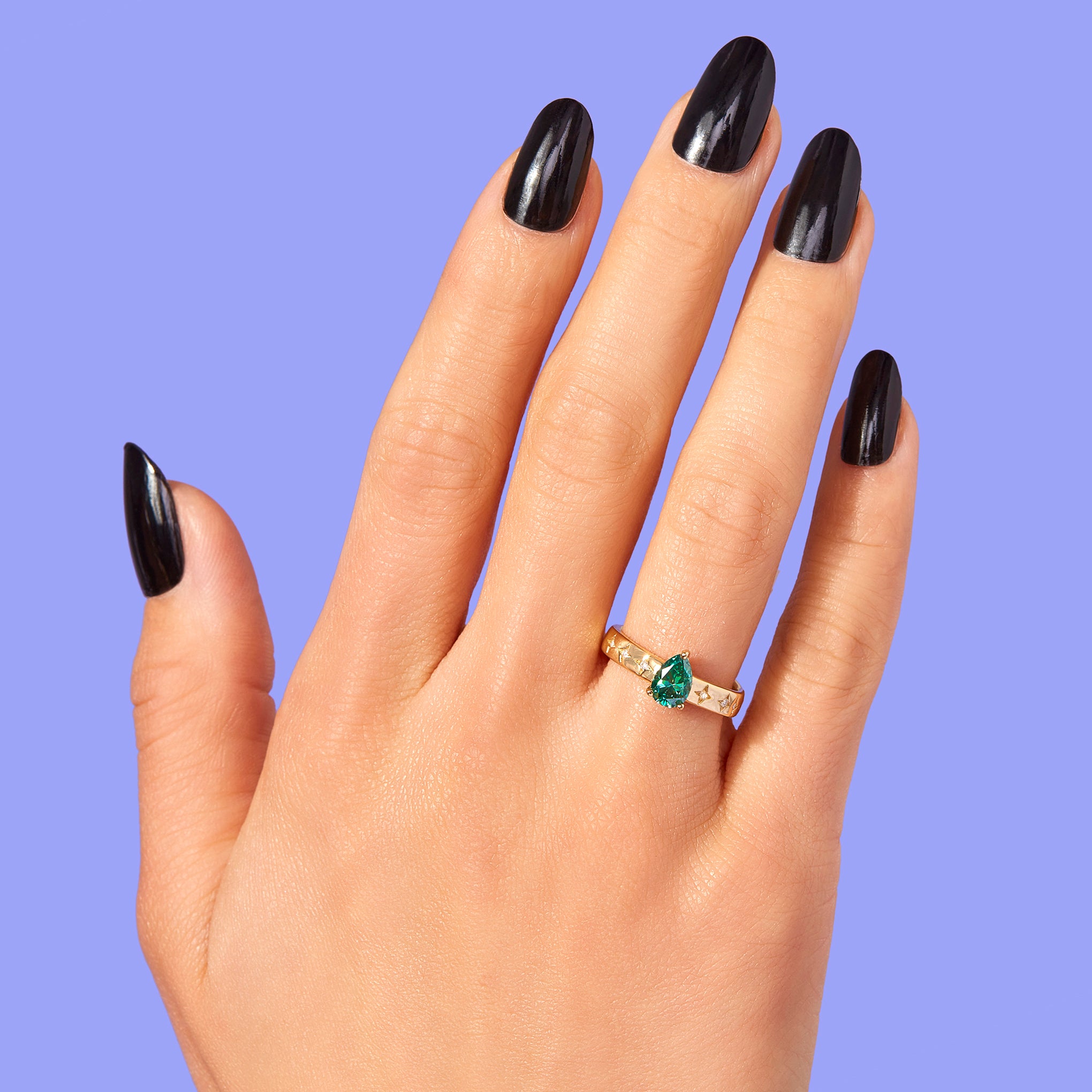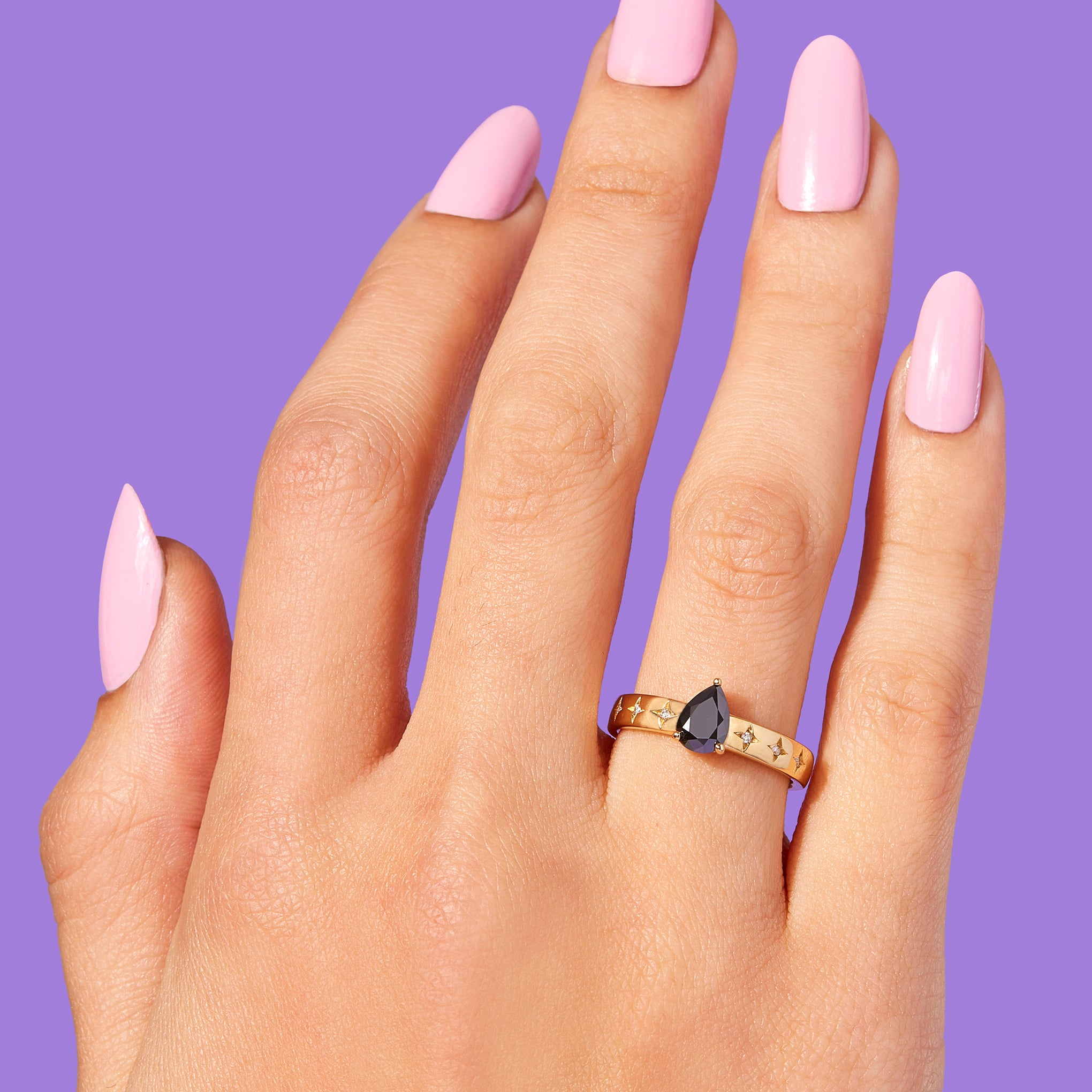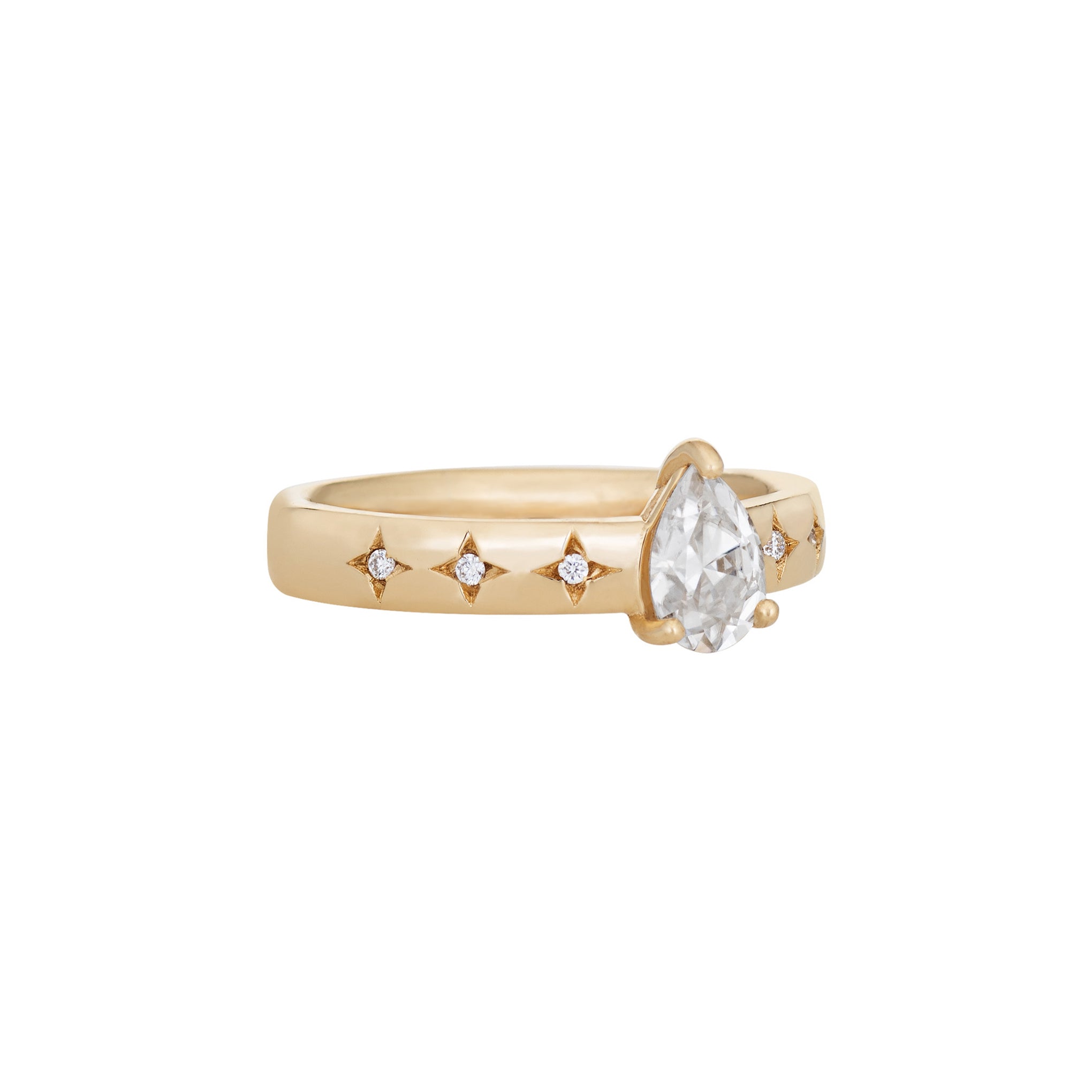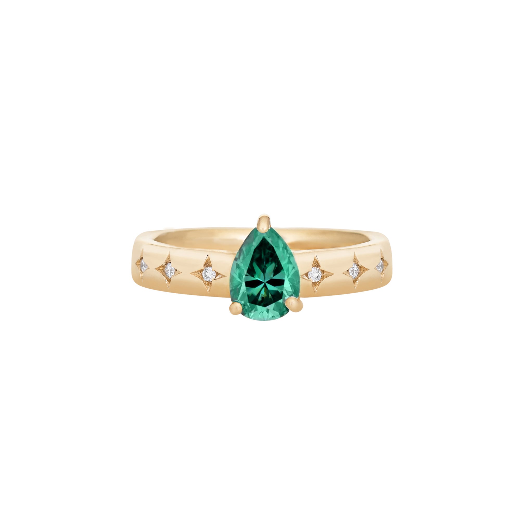 An elegant and classic ring with a low profile center stone. Etched star details with accent stones on the sides of the band lend to the ring's vintage feel. Handmade in Los Angeles. CA using ethical and sustainable gemstones and recycled 14K Gold.