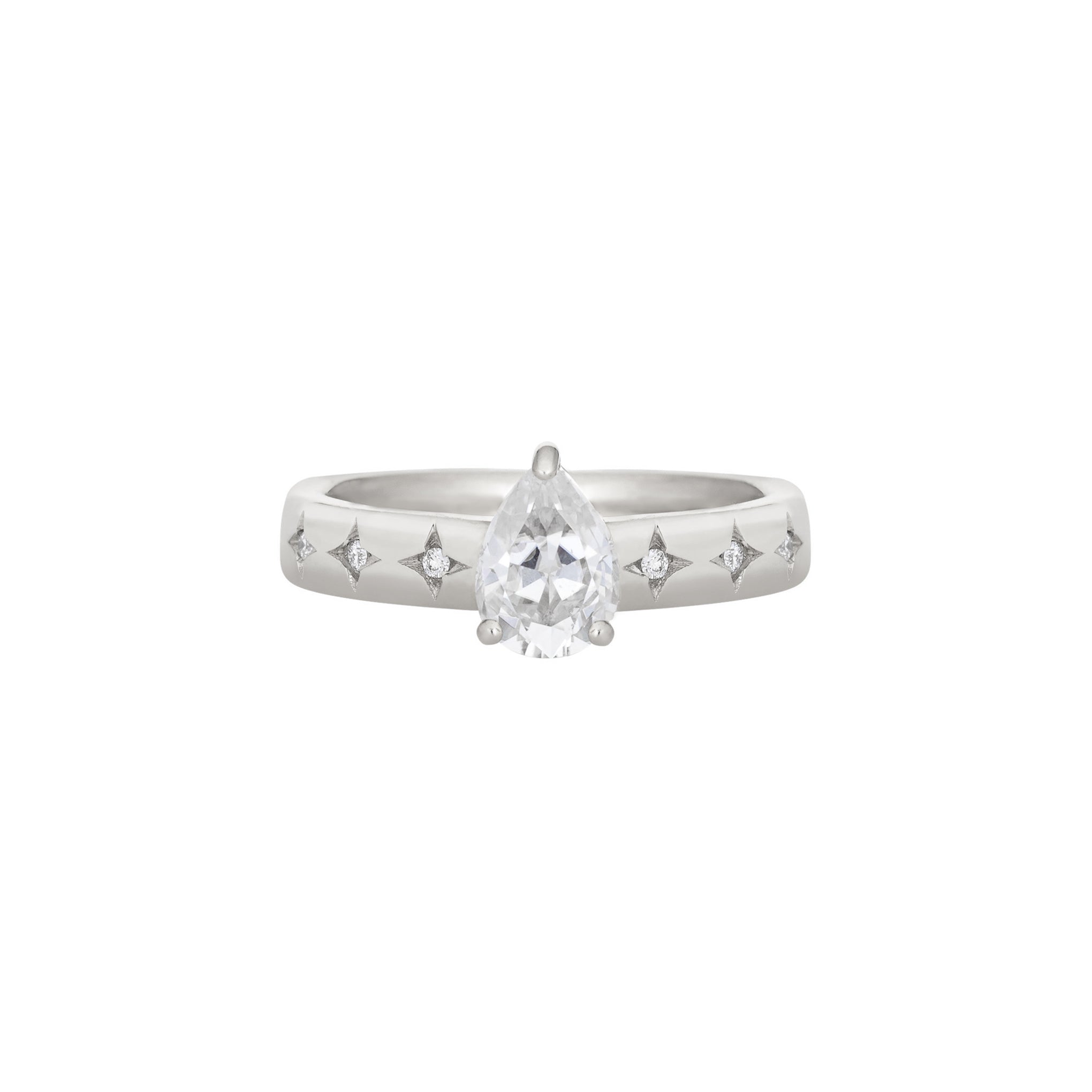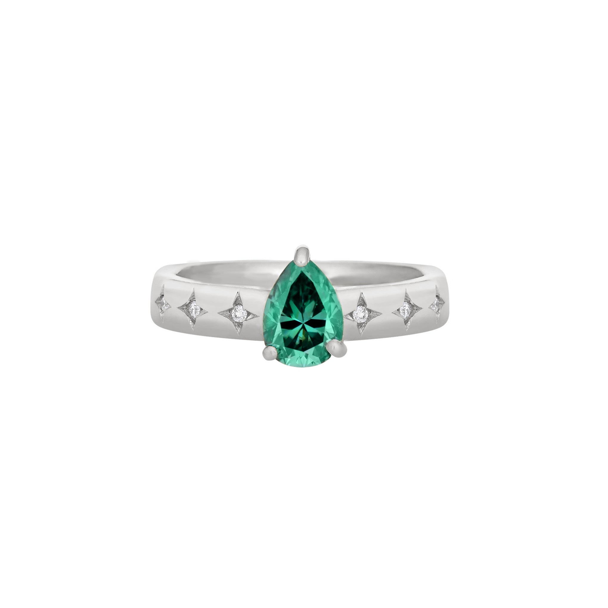 - Center Stone: Pear Lab Diamond or Moissanite; 7x5mm
