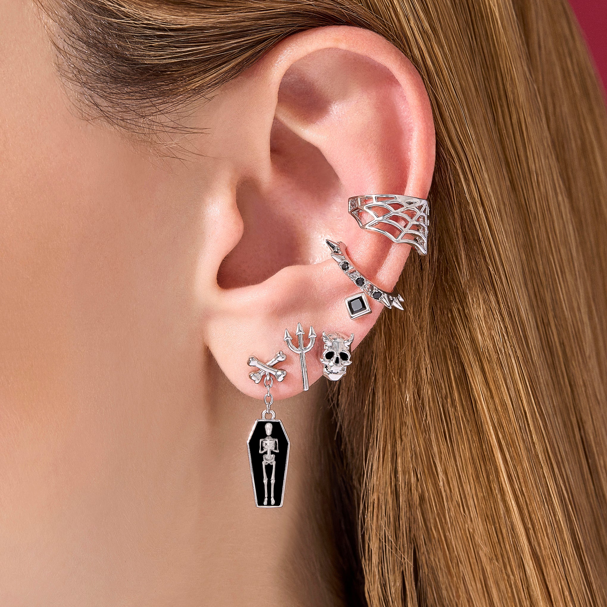 A reminder that life endures beyond time. the skeleton has long been seen as a symbol of eternity and resilience. Suspended in coffin shaped frames. these chain drop earrings hang from crossbones. Together they represent both mortality and the beauty of what lasts beyond it. carrying a sense of strength and permanence.