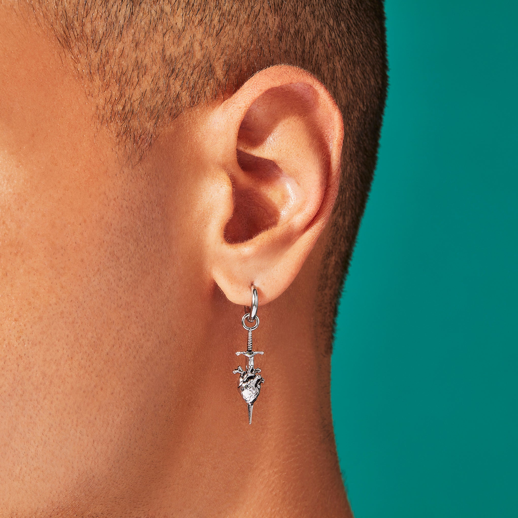 Like a knife through the heart. This symbol of protection charm hangs from a 12mm stainless steel hoop.