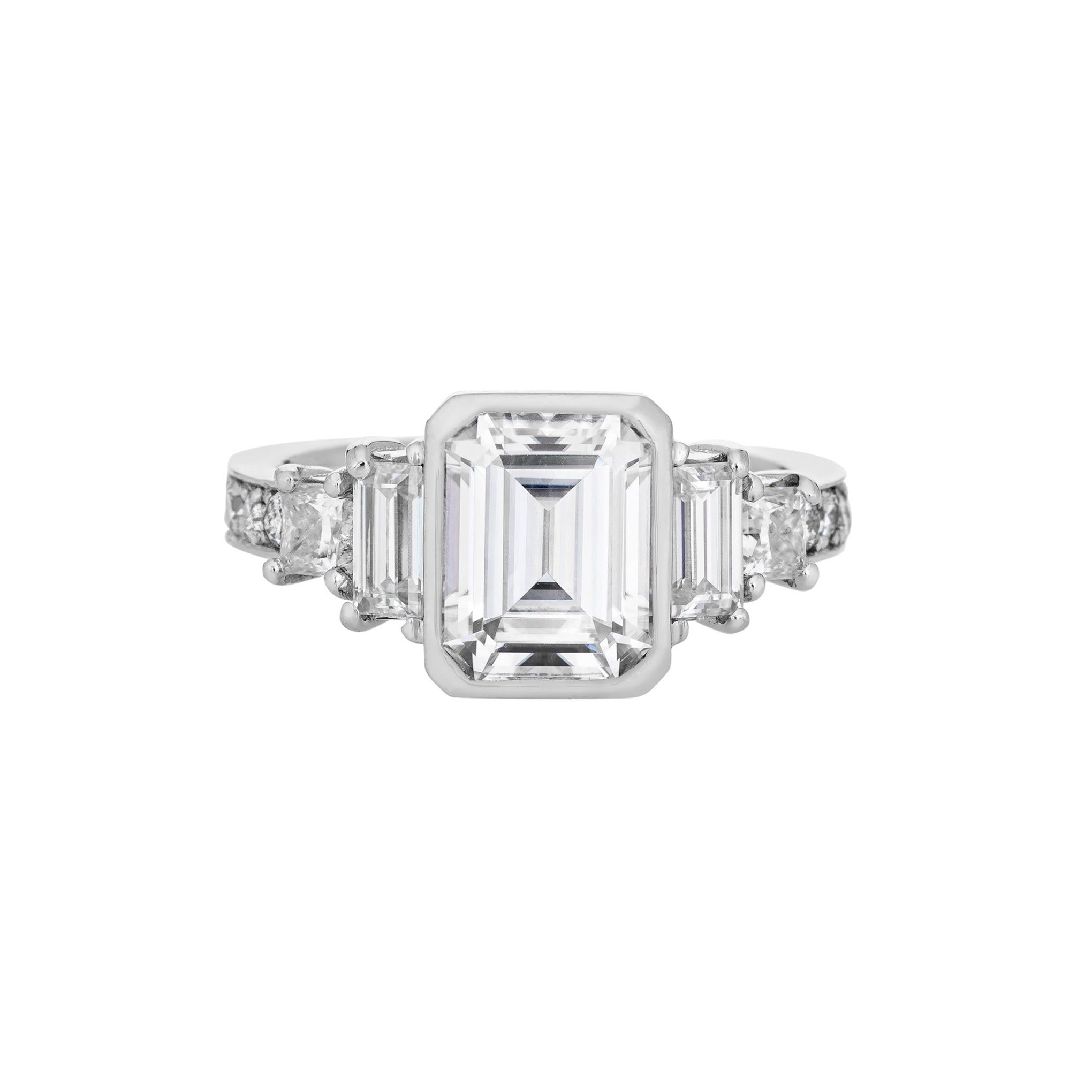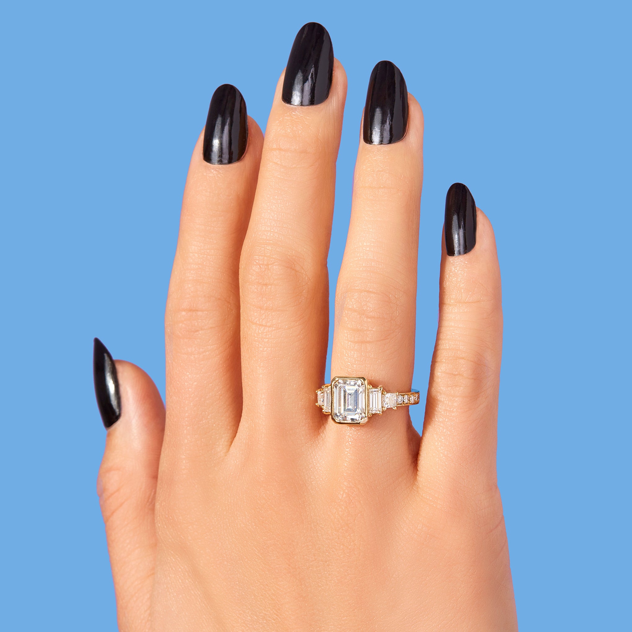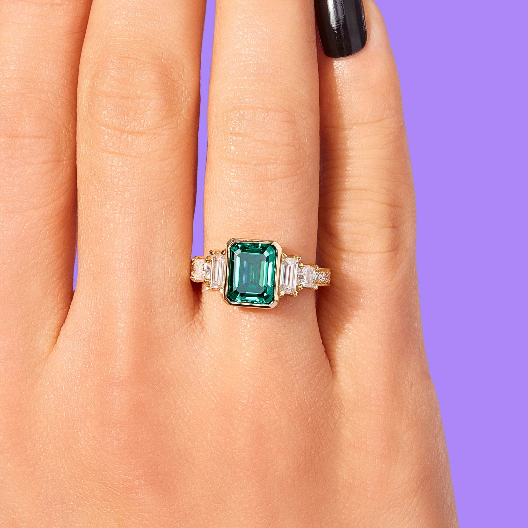 - Center Stone: Emerald Step-Cut Moissanite; 9x7mm