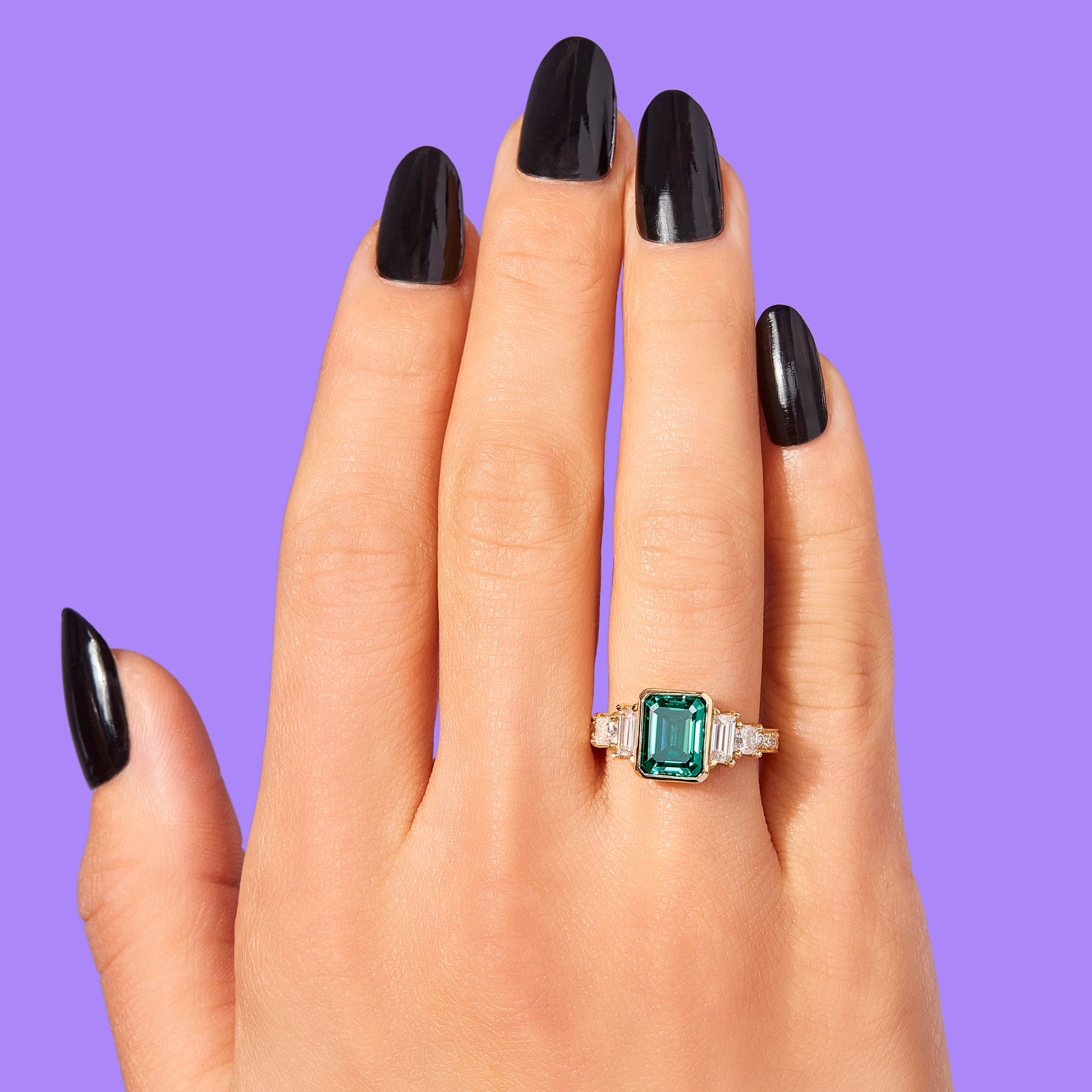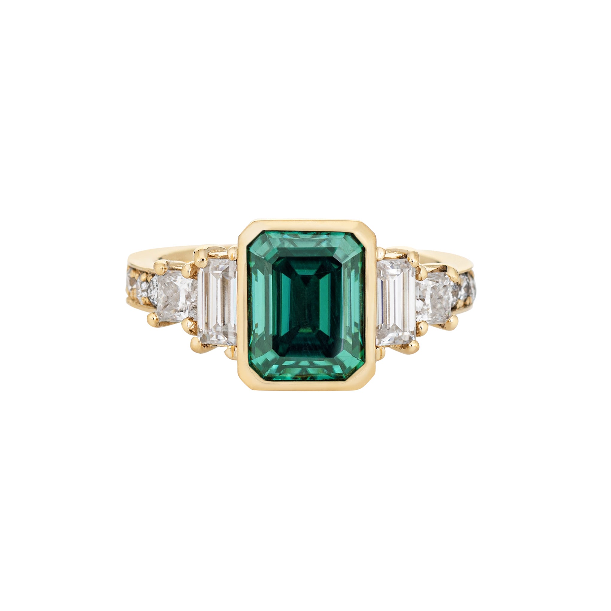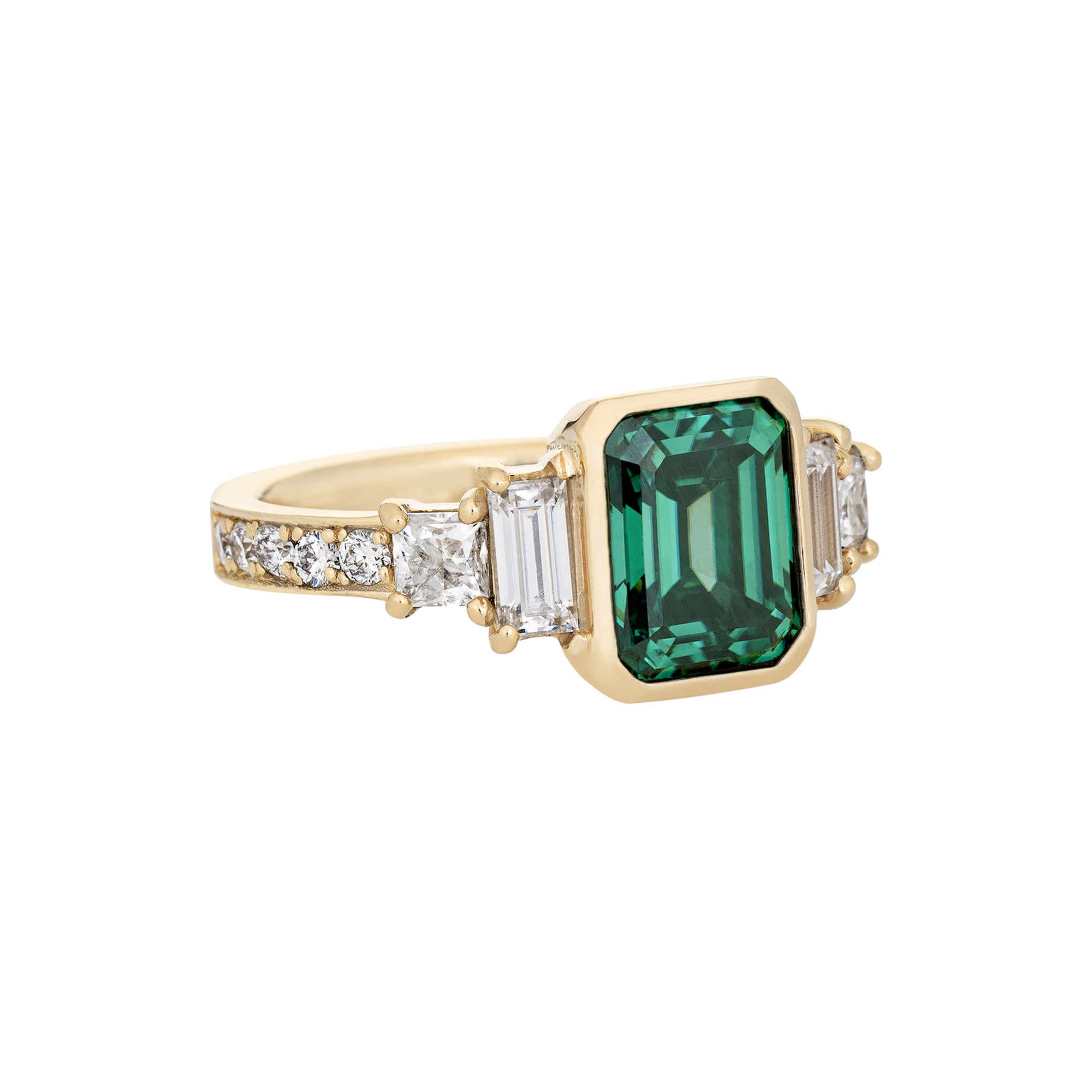 This bold ring features a substantial emerald step-cut Moissanite center stone flanked by sparkling baguettes and princess cut stones. creating a stunning Art Deco inspired geometric shape. Handmade in Los Angeles. CA using ethical and sustainable gemstones and recycled 14K Gold.