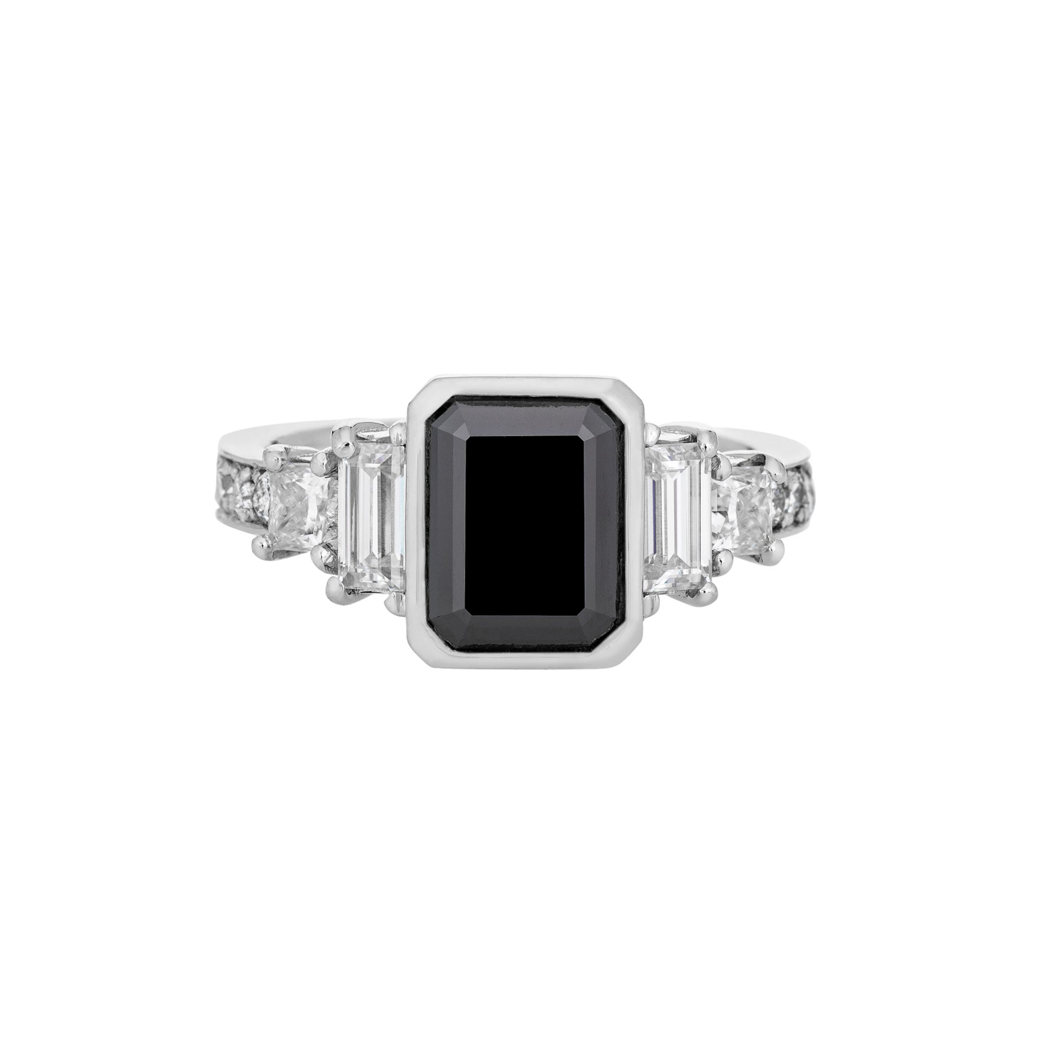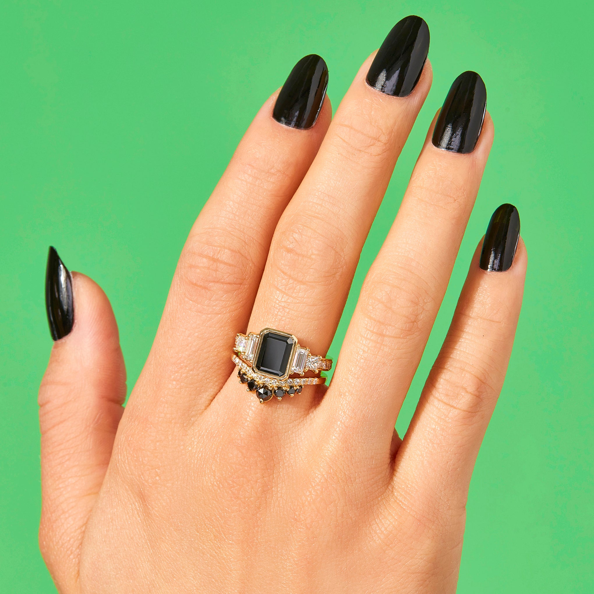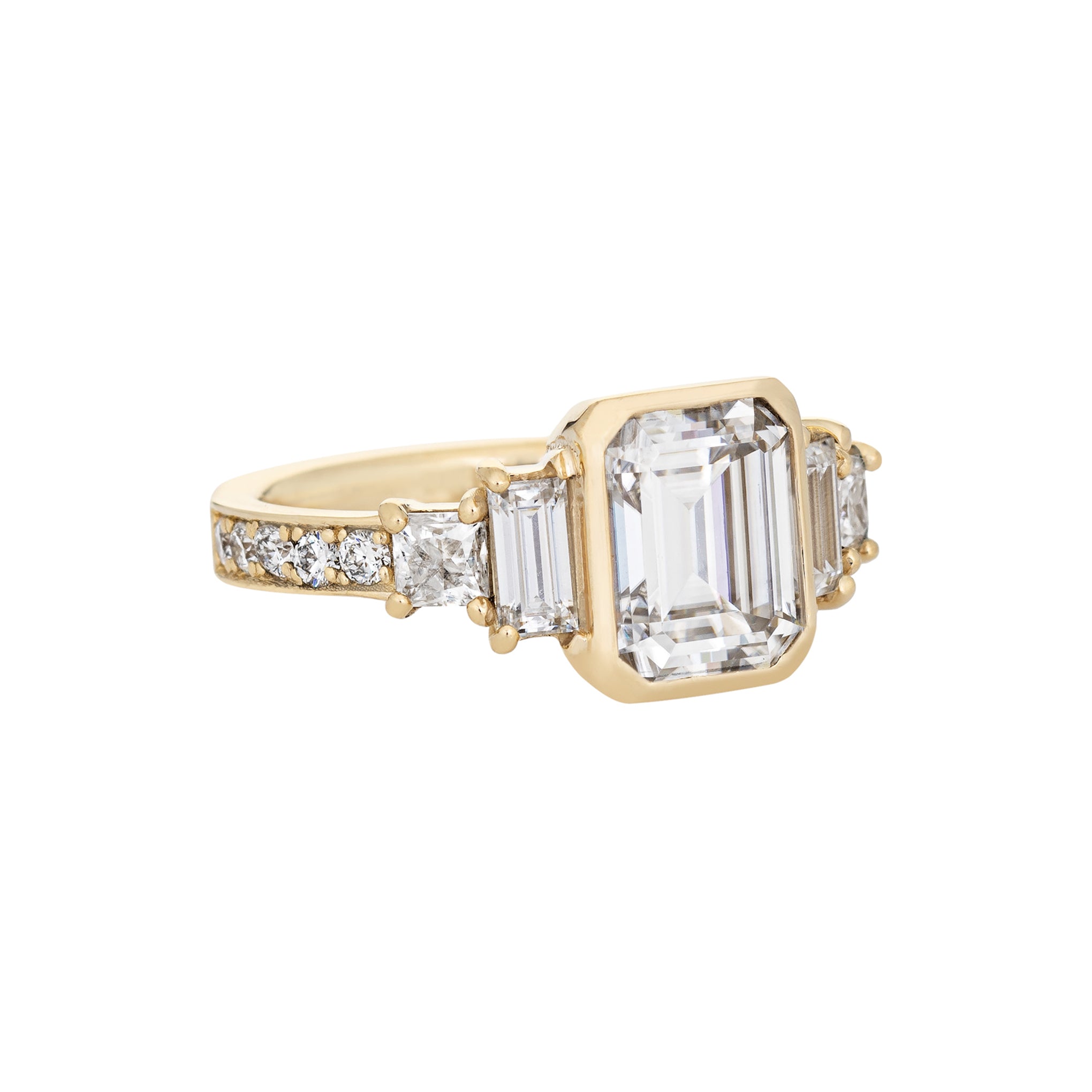 This bold ring features a substantial emerald step-cut Moissanite center stone flanked by sparkling baguettes and princess cut stones. creating a stunning Art Deco inspired geometric shape. Handmade in Los Angeles. CA using ethical and sustainable gemstones and recycled 14K Gold.