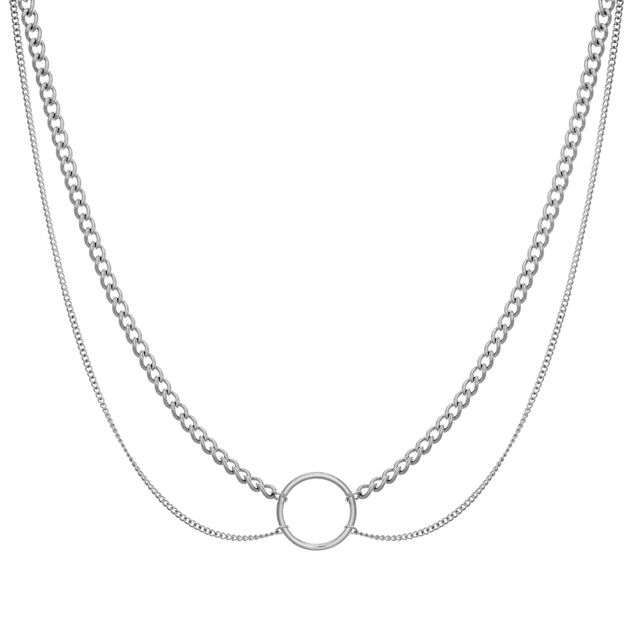 This double chain O ring style necklace is created in hypoallergenic stainless steel. The larger chain is 14in with an additional 3in extension chain making it perfect on its own. layered. or paired with any of our charms to create a custom necklace.