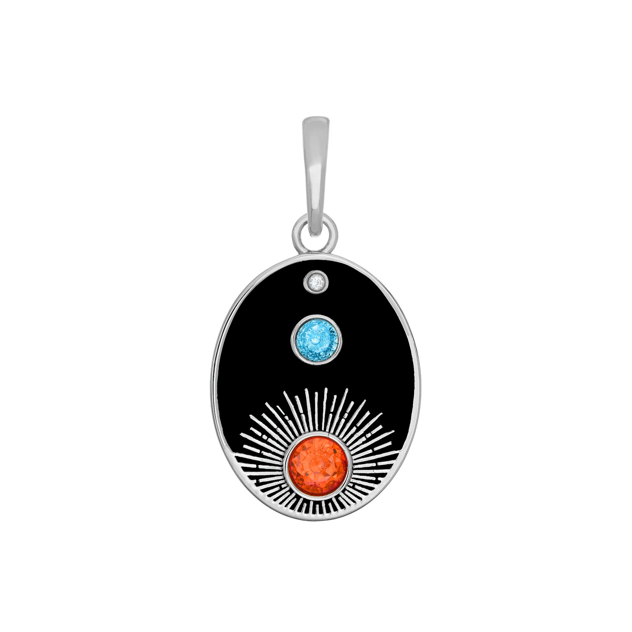 Even when you are standing still. you're moving. This is because the Earth and everything in our solar system is always on the go. The Sun is the center of it all. It takes the Sun 25 days to completely rotate around while the Earth takes 24 hours to rotate. As the Earth rotates. causing day and night. it is also revolving around the Sun. This orbit takes 365 ¼ days to complete. As the Earth orbits the Sun. the Moon is orbiting the Earth. It takes the Moon 27 ½ days to orbit the Earth. but since the Earth is always moving it takes the moon two extra days (29 ½) to come back to the same place in our sky. When they all line up. a Lunar or Solar Eclipse occurs. Stay in orbit with this cosmic charm.