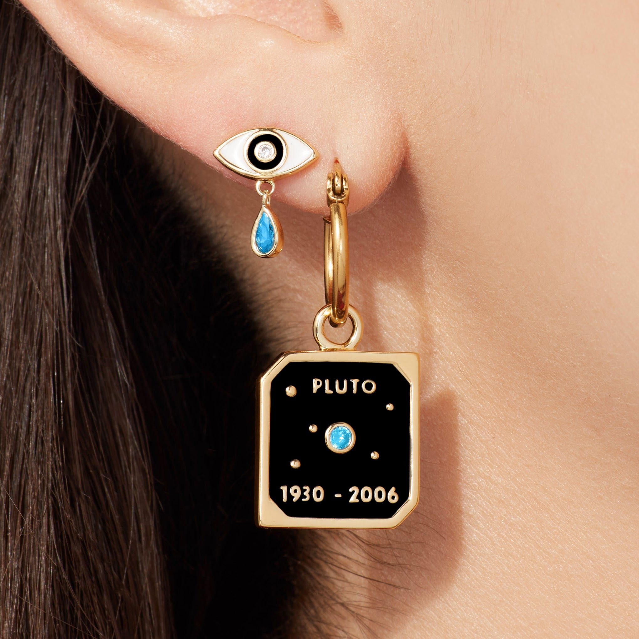 When Pluto was discovered in 1930. it was declared to be the ninth planet from the Sun. Beginning in the 1990s. its status as a planet was questioned following the discovery of several objects of similar size also located in the Kuiper belt. In 2006. the International Astronomical Union formally reclassified Pluto as a dwarf planet. Shown here with its five known moons. we pay homage to Pluto's short lived planet status in this cosmic charm.