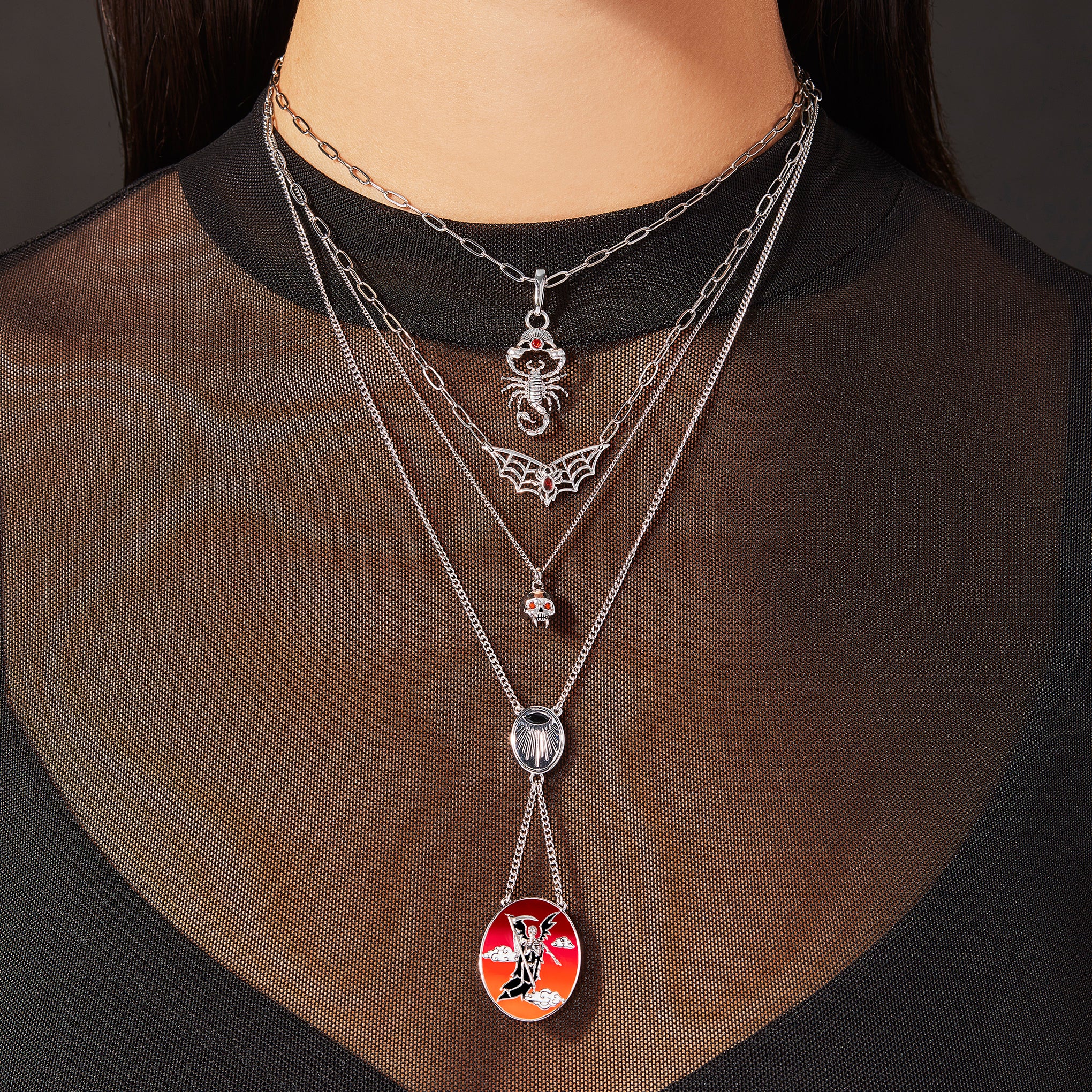Most cultures have figures to represent death. The personification comes to collect your soul or guides you to the afterlife. This antique style necklace depicts the Grim Reaper hovering amongst the clouds in a fiery red sky. scythe in hand. ready to make his next move.