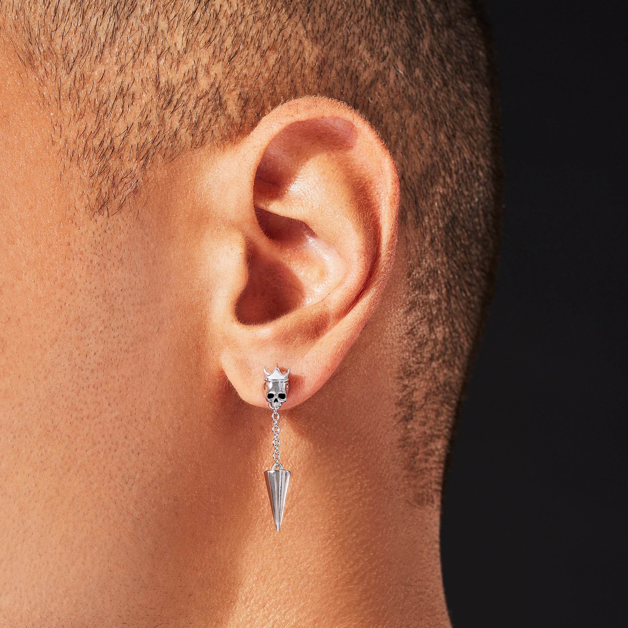 A skull wears a crown in this stud drop earring with a spike hanging from a 14mm chain.