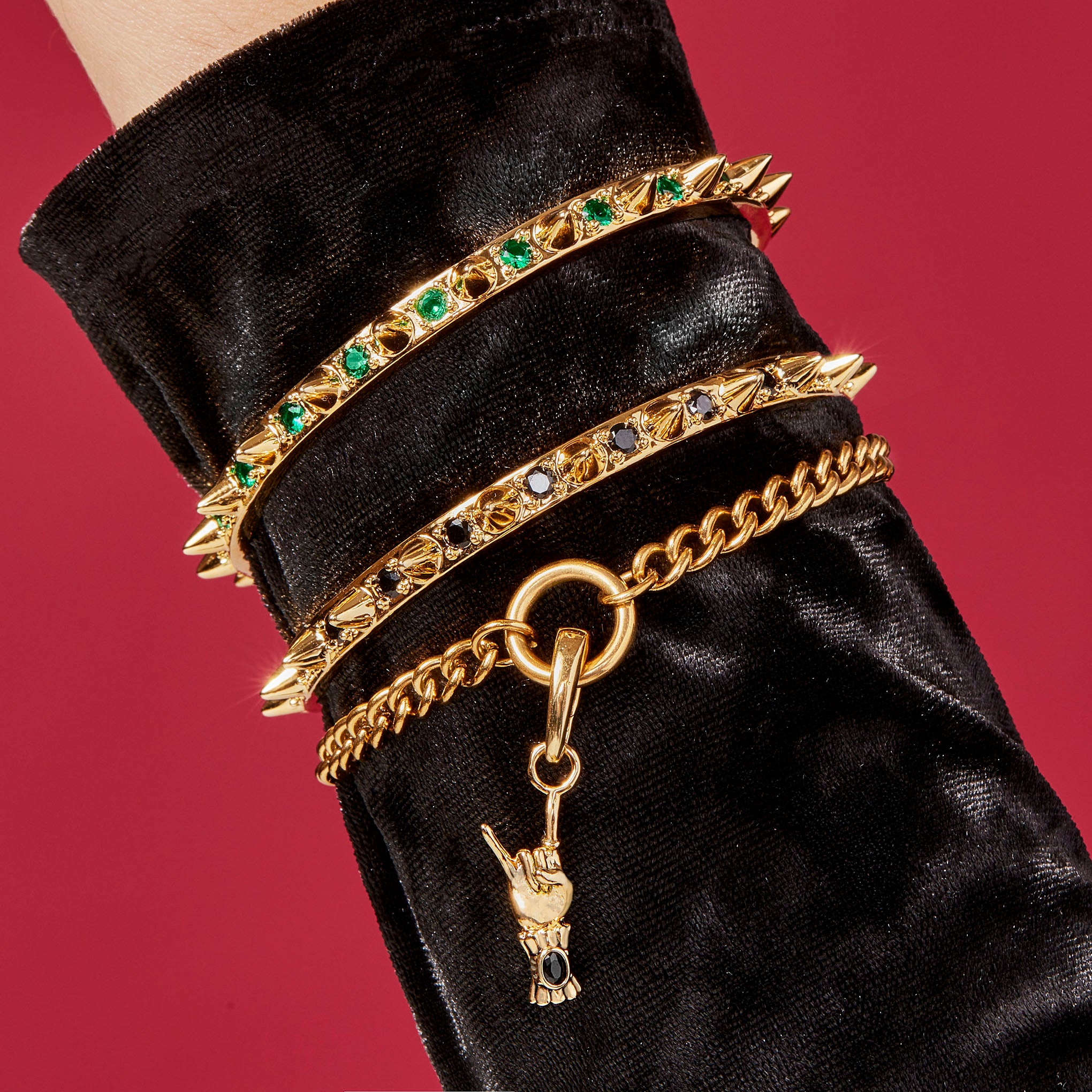 A spiked cuff bracelet to give an edge to any outfit. A glam take on the classic punk bracelet. this cuff is available in 3 colors. Squeeze gently to adjust the fit.