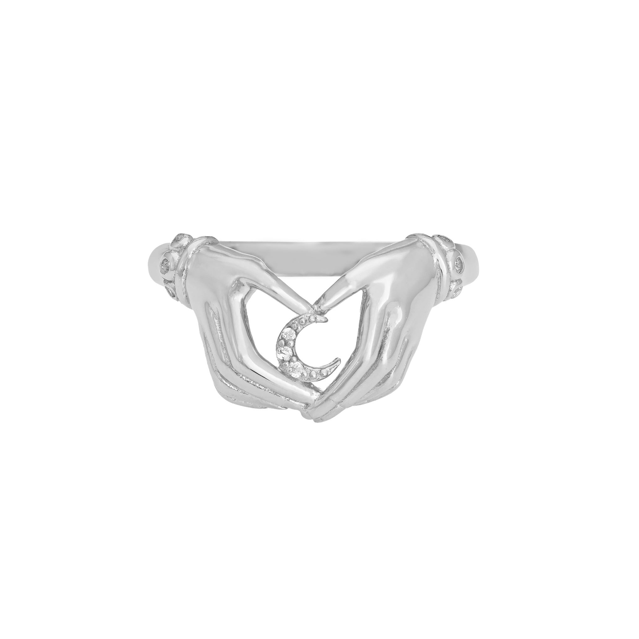 Inspired by antique Victorian jewelry. two hands hold a sparkling crescent moon in this sterling silver ring.