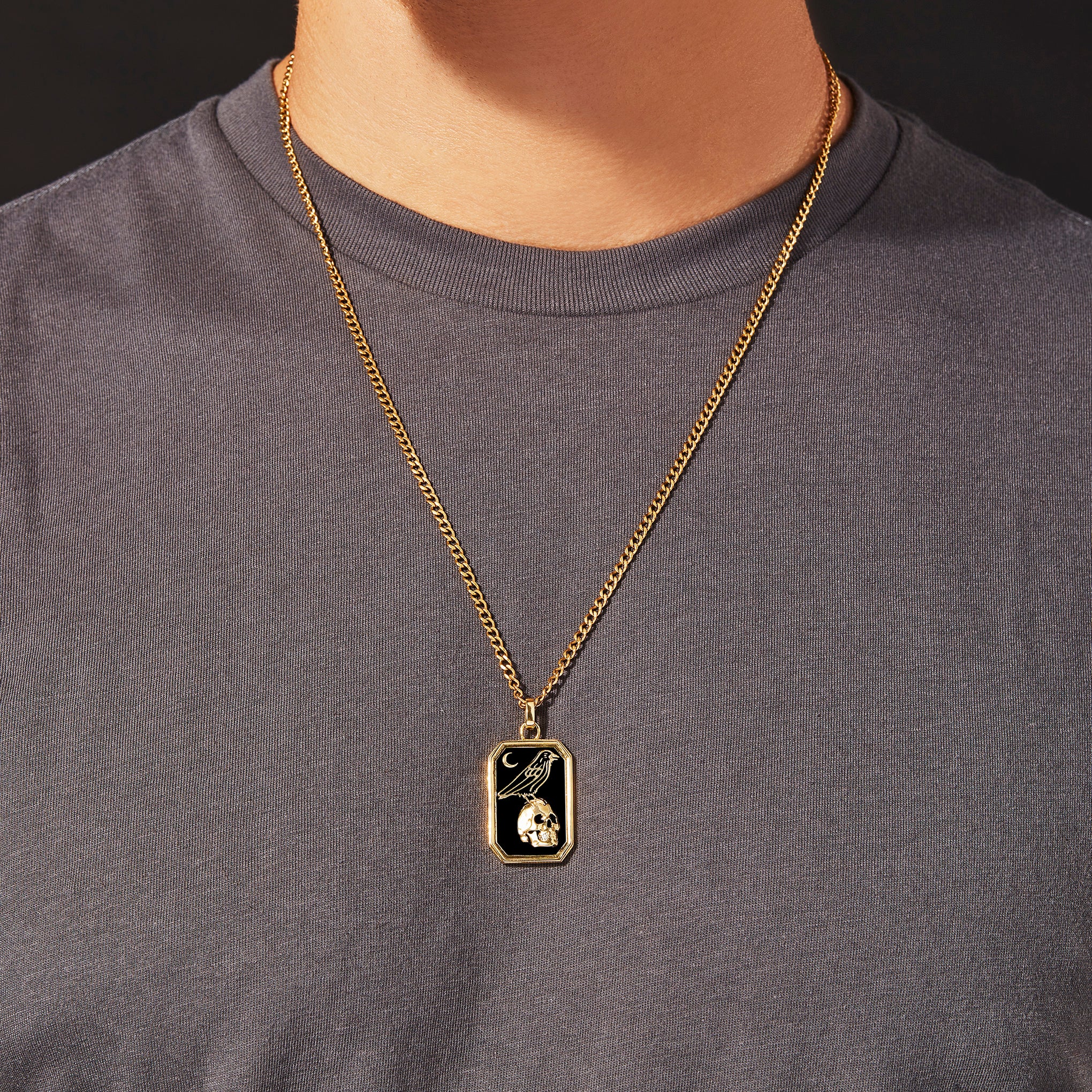 A raven sits atop a skull in this haunting pendant paired with a 24in stainless steel 3mm cuban link chain.