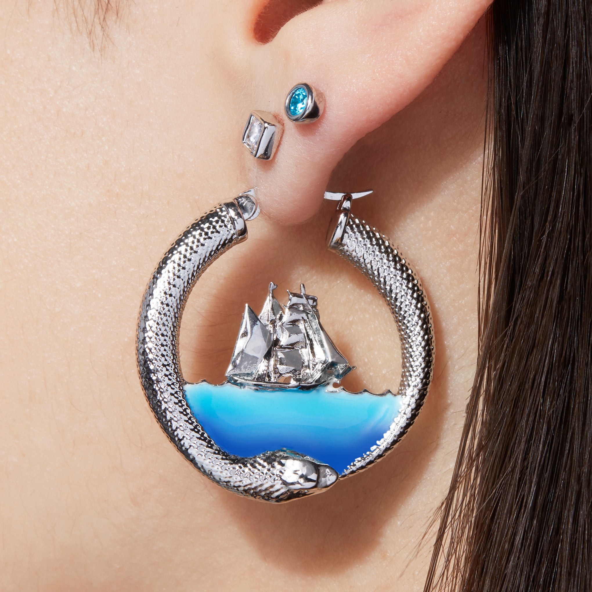 Sea monster accounts are found in the folklore of virtually all cultures that have contact with the sea. Some hypotheses suggest that these monsters were based on creatures such as the colossal squid or were surviving specimens of giant marine reptiles from the Jurassic and Cretaceous Periods. Ship damage from tropical cyclones may also be another possible origin of sea monster legends. Cooler than your standard snake hoops. these sea serpents closing in on ships are the ultimate statement earrings.