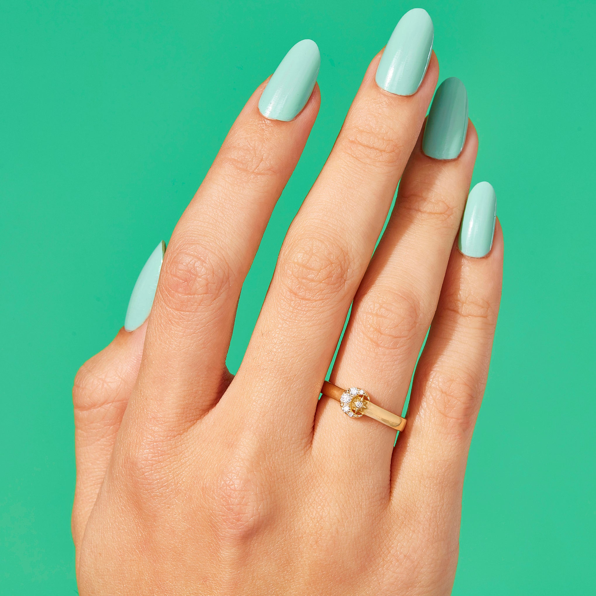 A classic comfort fit band featuring a crescent moon with graduated diamonds and a star center. Handmade in Los Angeles. CA using ethical and sustainable gemstones and recycled 14K Gold.