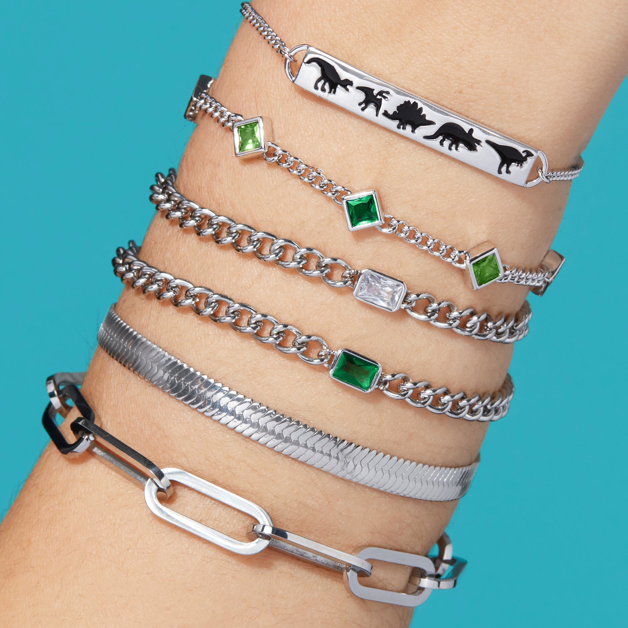 Our hypoallergenic stainless steel Stella Bracelet chain measures 6.5in with a 2in extension chain to adjust the length. This bold. large paperclip chain bracelet is perfect on its own or paired with any of the pieces in our Charms Collection.