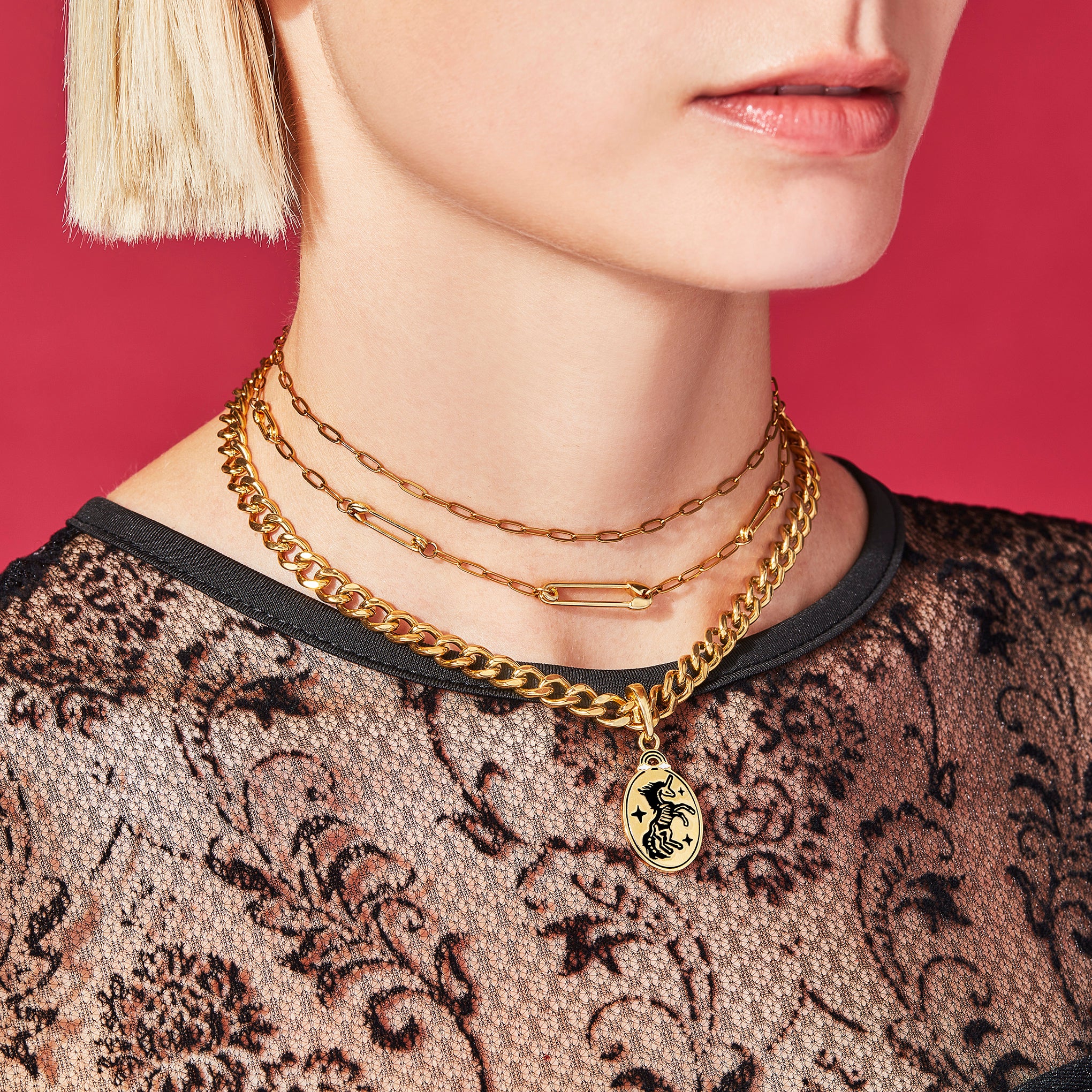 Our hypoallergenic stainless steel Vesper Necklace measures 15in and has a 2in extension chain to adjust the length. This bold curb chain choker necklace is perfect on its own. layered. or paired with any of the pieces in our Charms Collection.