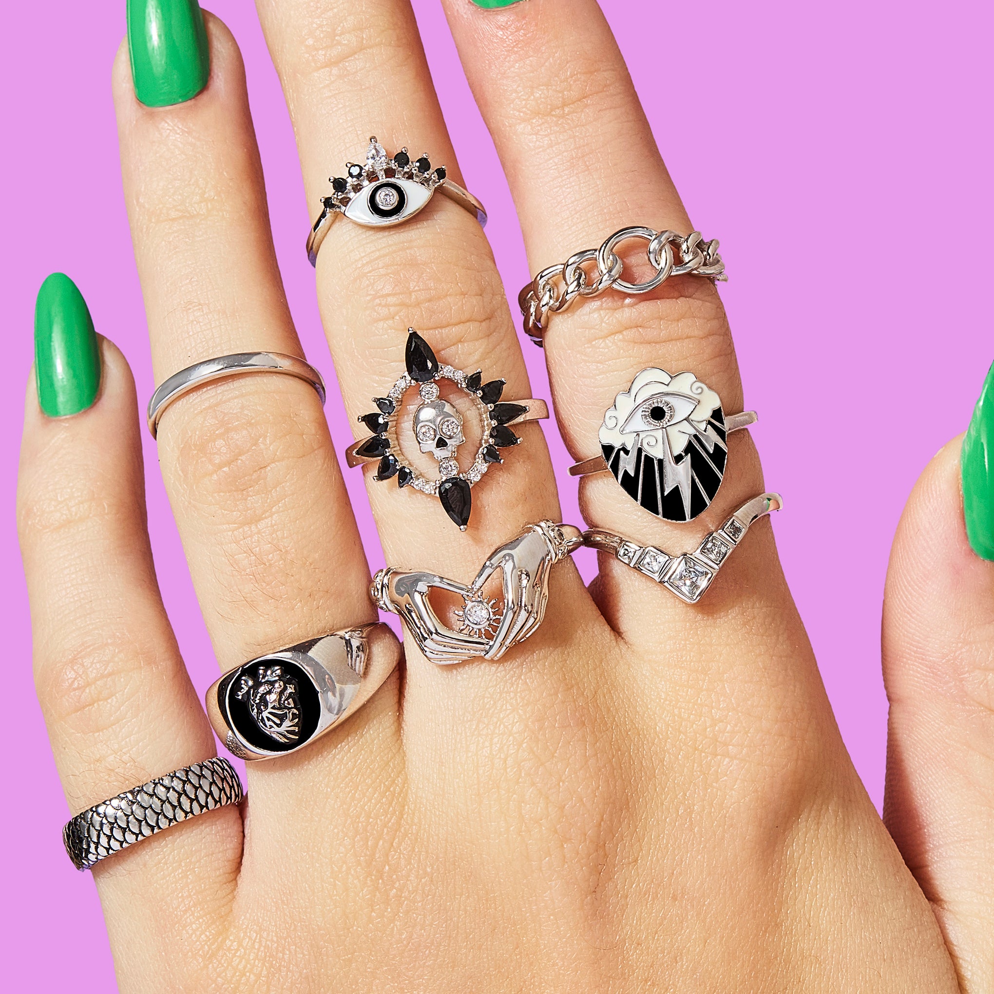A lightning bolt emerges from an all-seeing eye within the clouds. evoking ancient symbols of intuition. protection. and sudden clarity. With bold lines and intricate enamel detail. this sterling silver ring serves as a mystical accent meant to channel your inner spark and power.